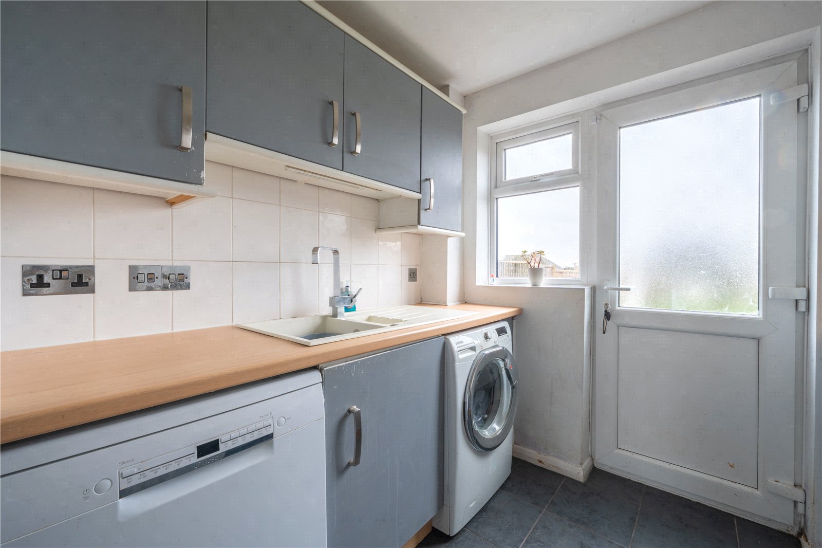 A rear-facing window and glazed door allow good natural light and provide direct access to the garden, enhancing both convenience and ventilation. Finished with tiled flooring, this kitchen offers a solid and usable layout with scope for modernisation, ideal for buyers seeking a practical space with potential to personalise.