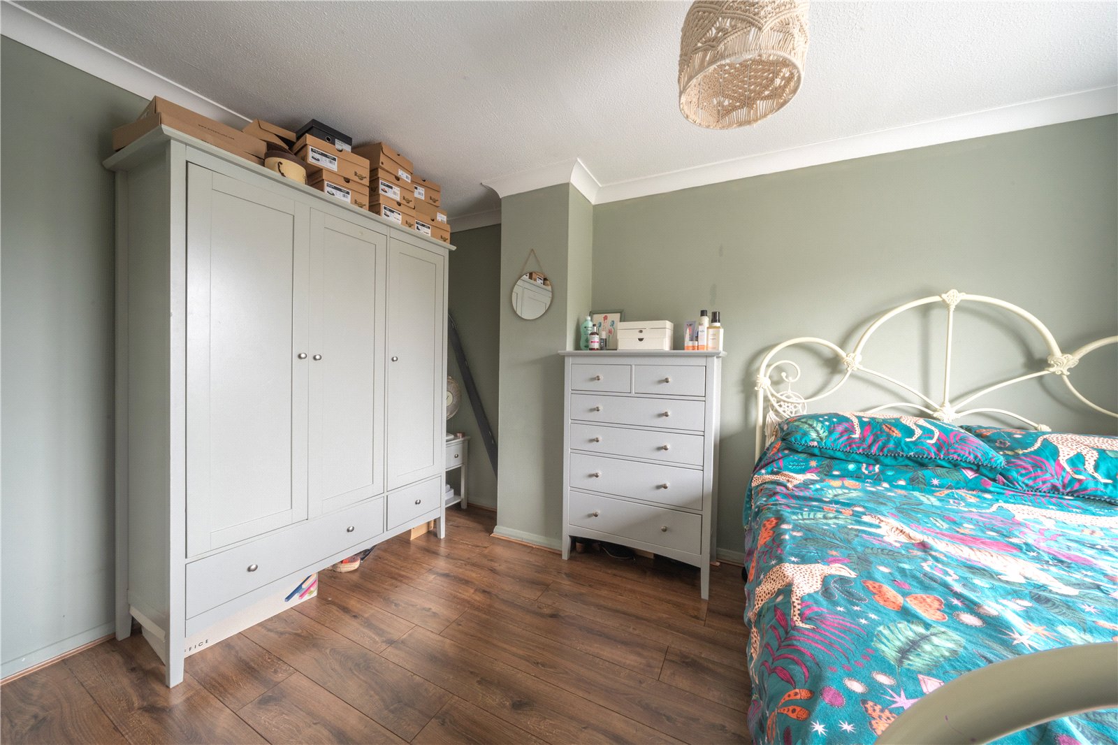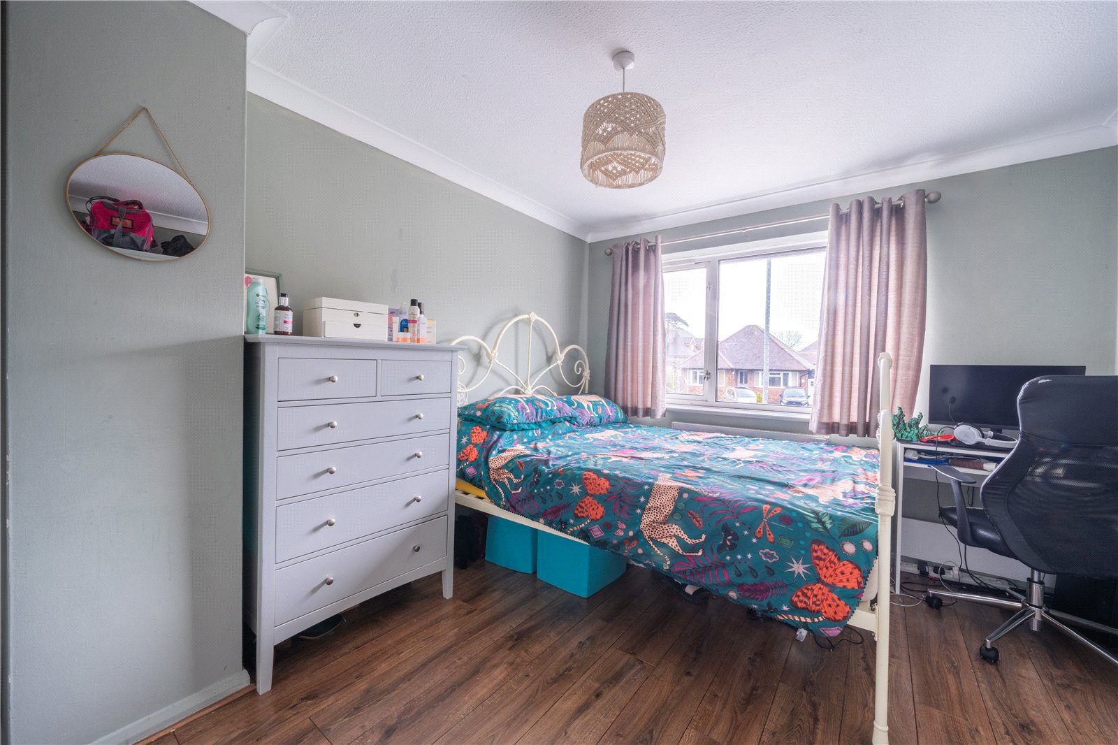 BEDROOM 1: A spacious and well-presented double bedroom enjoying a pleasant front-facing aspect and excellent natural light. The room comfortably accommodates a double bed along with freestanding bedroom furniture, as demonstrated, and also offers space for a desk or dressing area. Finished with wood-effect flooring and soft neutral décor, the bedroom provides a calm and versatile environment, ideal as a principal bedroom.