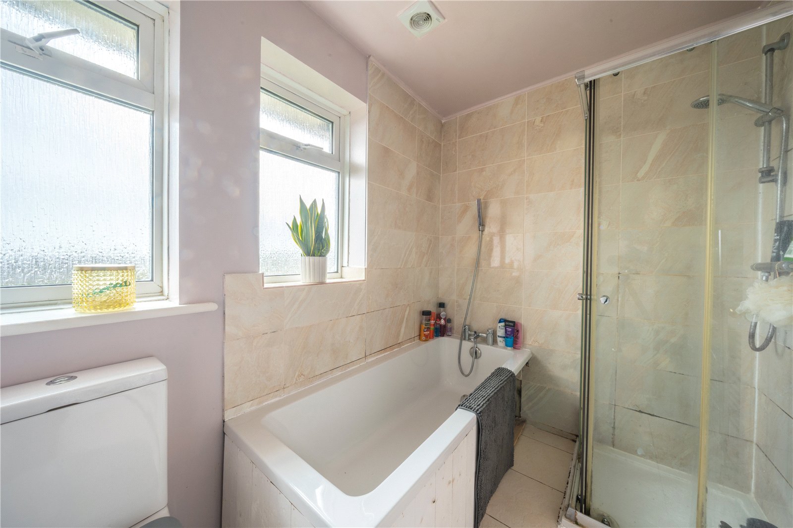 Two frosted windows allow excellent natural light while maintaining privacy, complemented by ceiling lighting and ventilation. This well-sized bathroom offers a functional layout with scope for personalisation, making it ideal for family living.