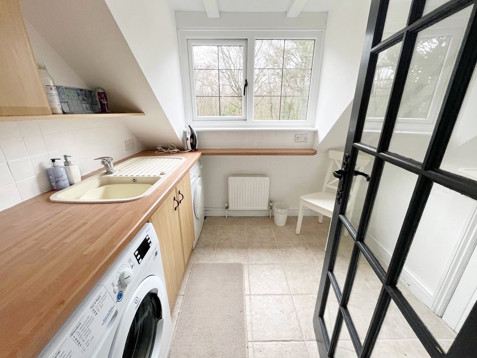 LAUNDRY ROOM: Comprising of a tiled floor, fitted units, with worktops over fitted sink and drainer, tiled surrounds, radiator, storage cupboards, spaces for dryer and washing machine, double glazed window with aspect over the front gardens.