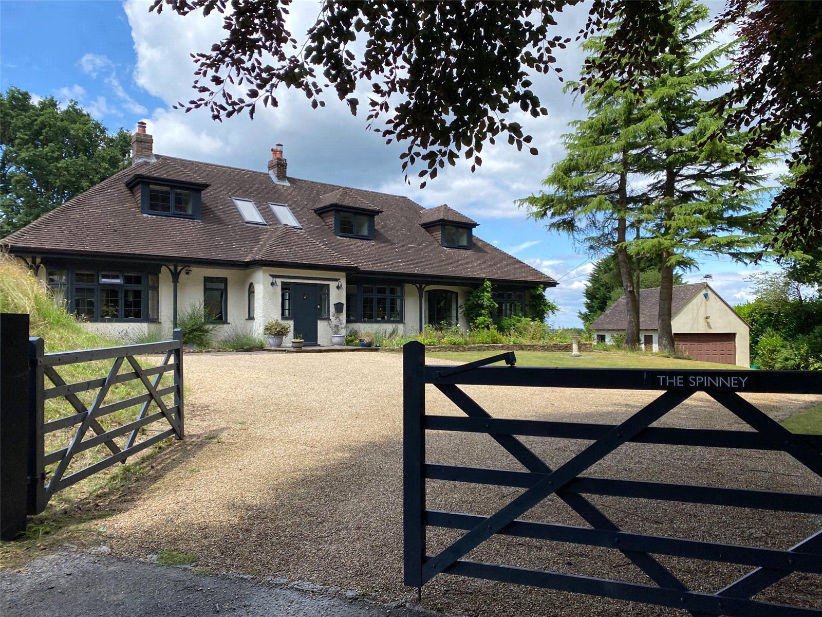 OUTSIDE: The property has a large gravelled entrance drive accessed via a pair of wooden gates, with the driveway leading past the house with landscaped gardens either side and beyond to a generous sized parking area.