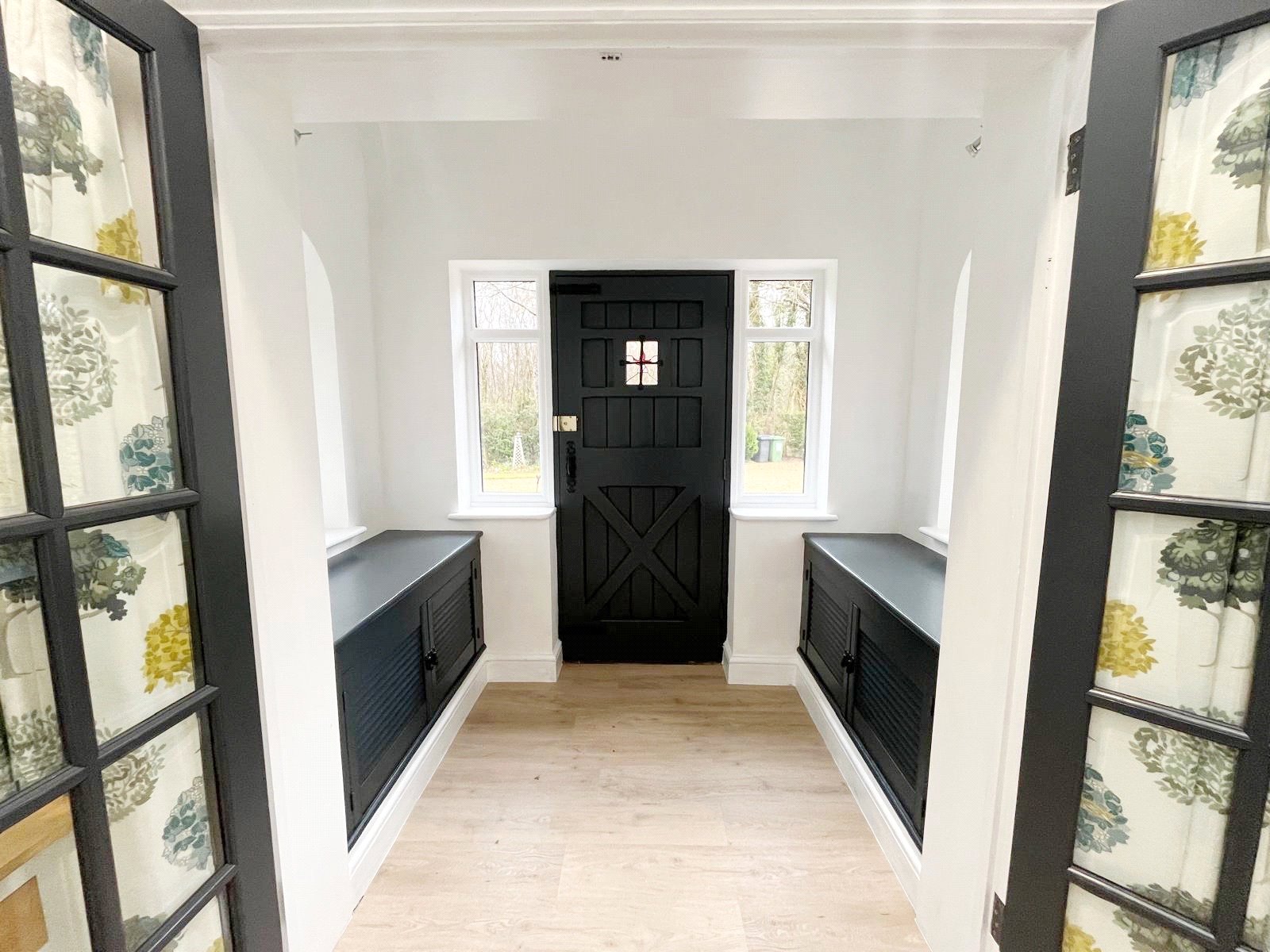 ENTRANCE VESTIBULE: Comprising of a triple aspect, storage cupboards and window seats to both sides, with double glazed arched windows also above, further double-glazed windows, to the front gardens, twin spotlights, twin paned and wooden doors opening into the impressive main reception hall.