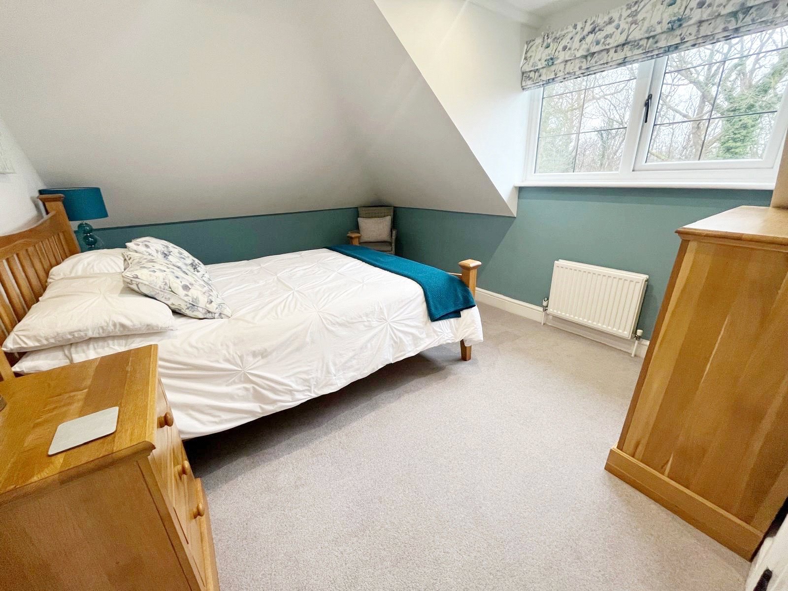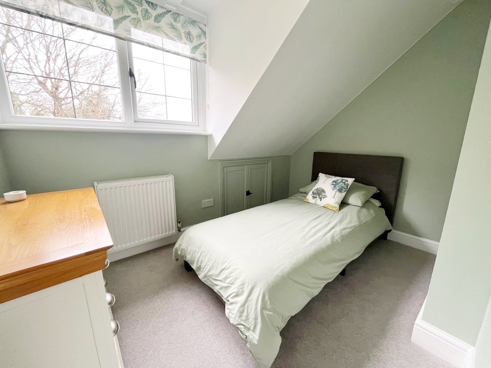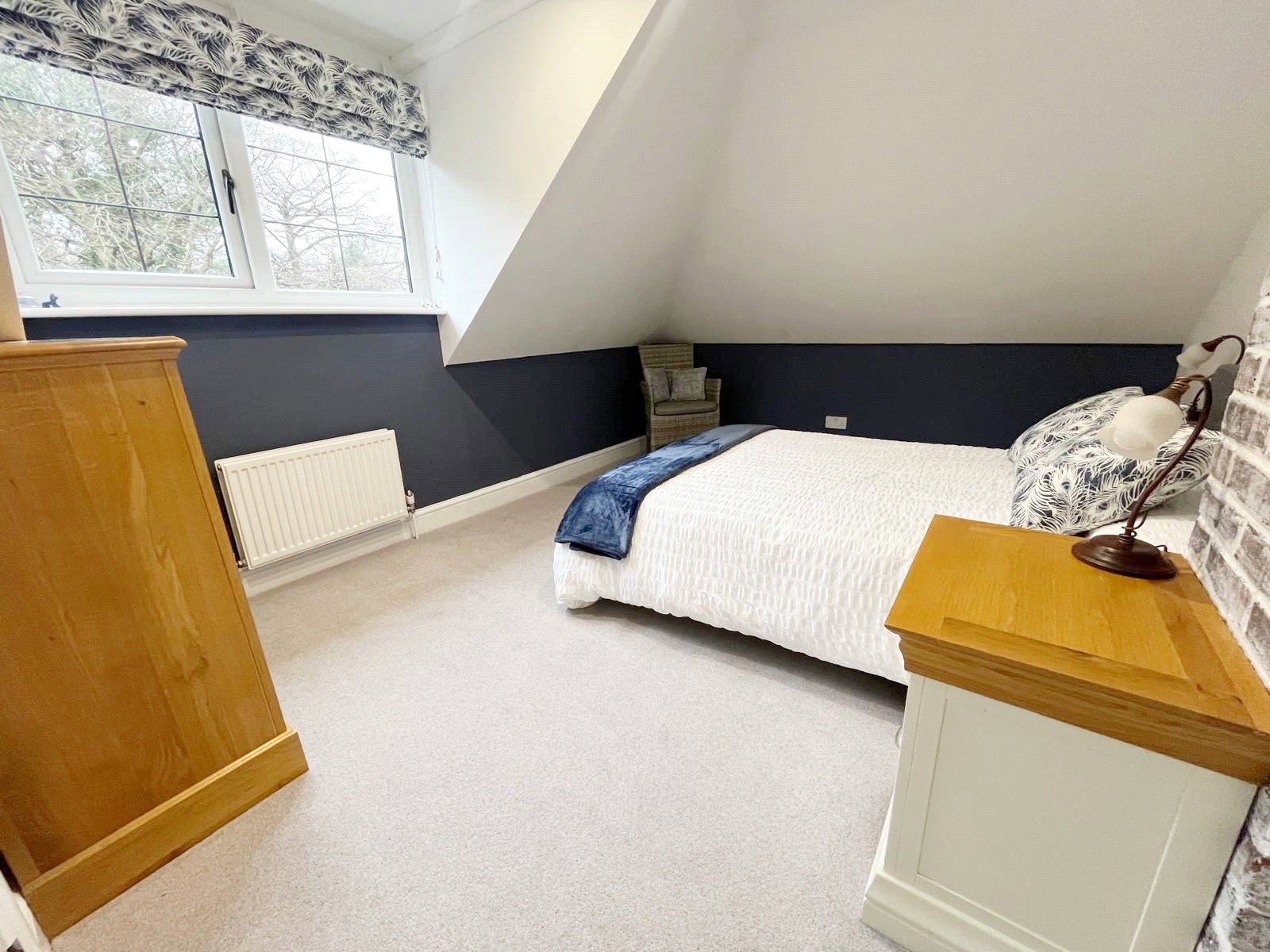 BEDROOM THREE: A double sized room with radiator, downlighting, fitted cupboard and double-glazed window with aspect over the front gardens and grounds.