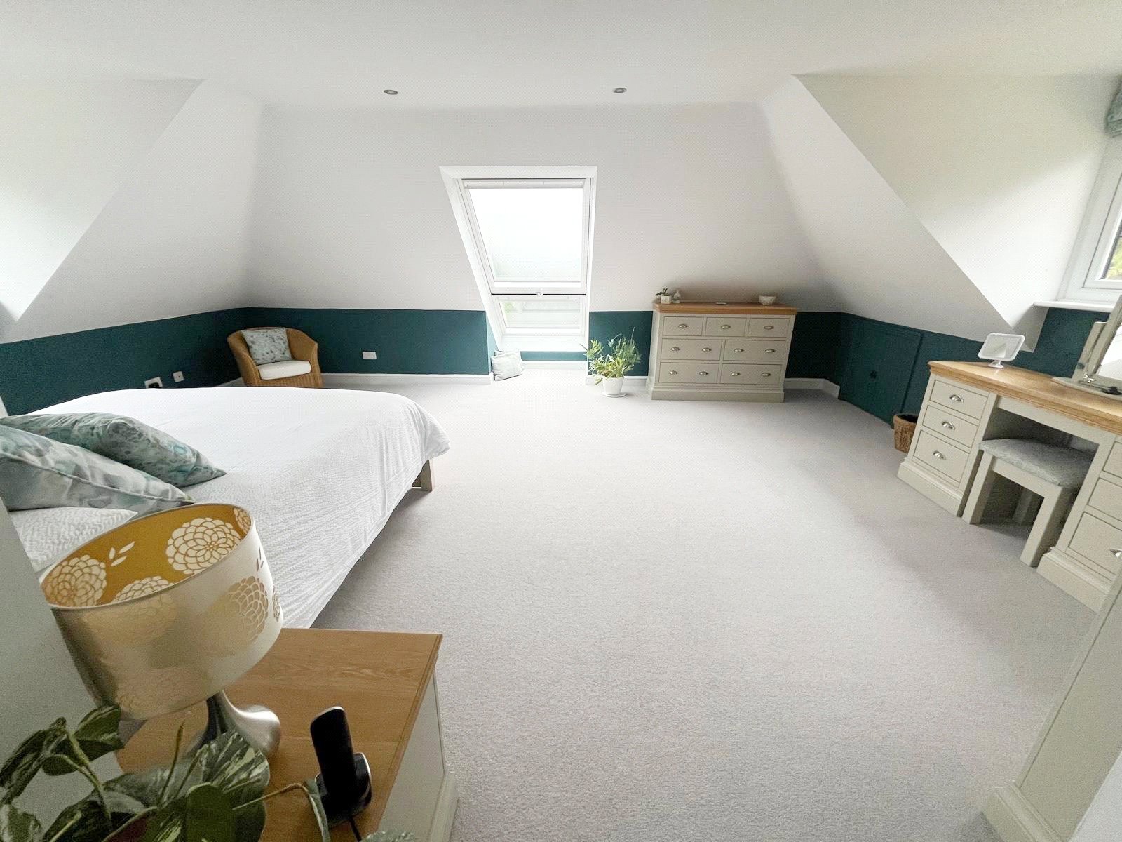BEDROOM ONE PRINCIPAL SUITE WITH AN ENSUITE DRESSING ROOM & AN ENSUITE SHOWER ROOM: This large double sized triple aspect bedroom has double glazed windows with amazing stunning far reaching panoramic rural views as far as the eye can see, downlighting, radiators, door to walk in wardrobe cupboard with radiator, further door to luxury ensuite shower room.