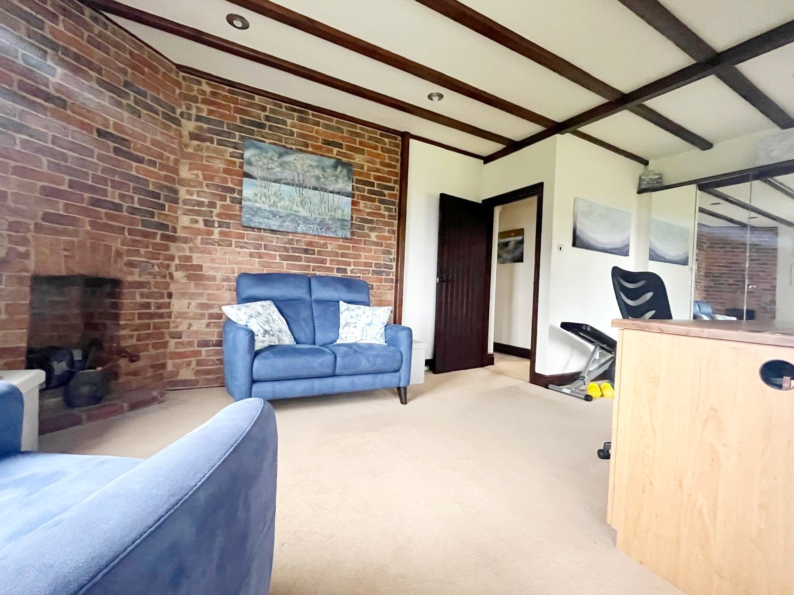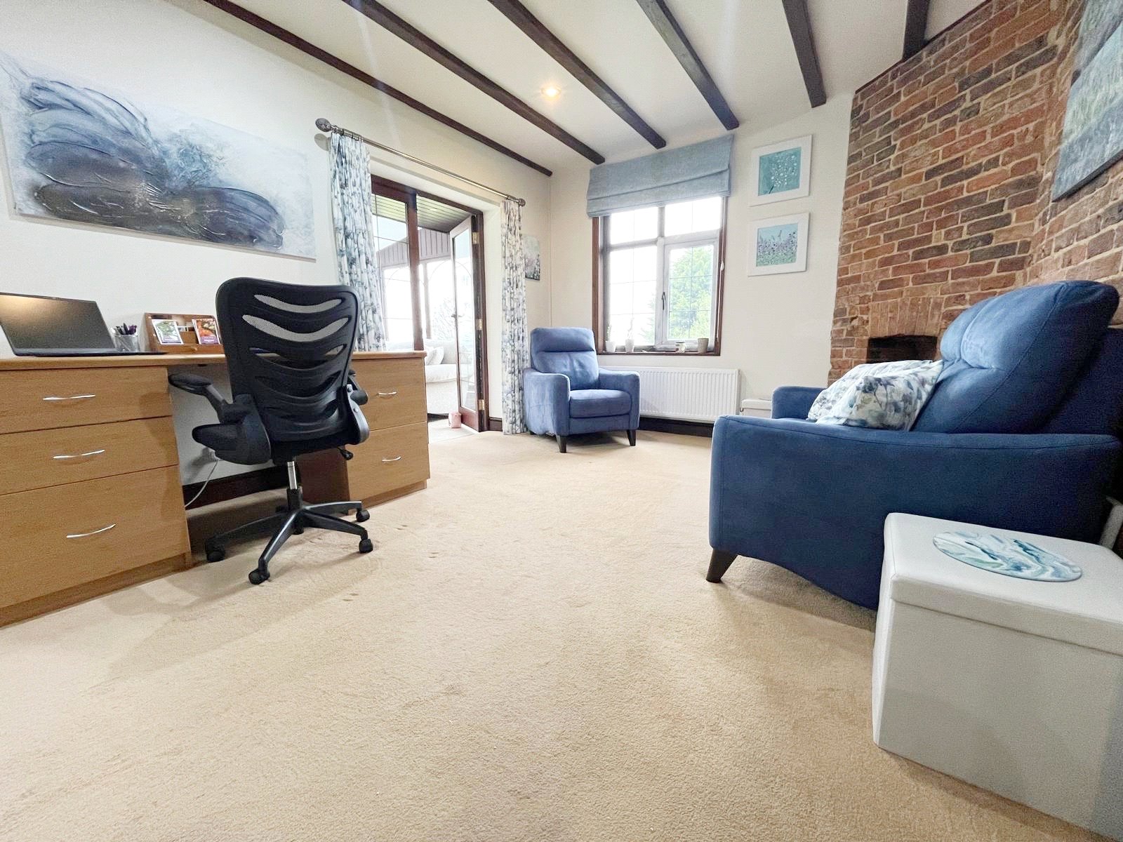 FAMILY ROOM / STUDY: A double aspect double sized room with high level beamed ceilings, down lights, brick feature fireplace, fitted cupboards, radiator, double glazed window with aspect to the side gardens with stunning rural views beyond, further double-glazed window with aspect over the rear gardens and wonderful rural views beyond, further twin double glazed doors to the conservatory.