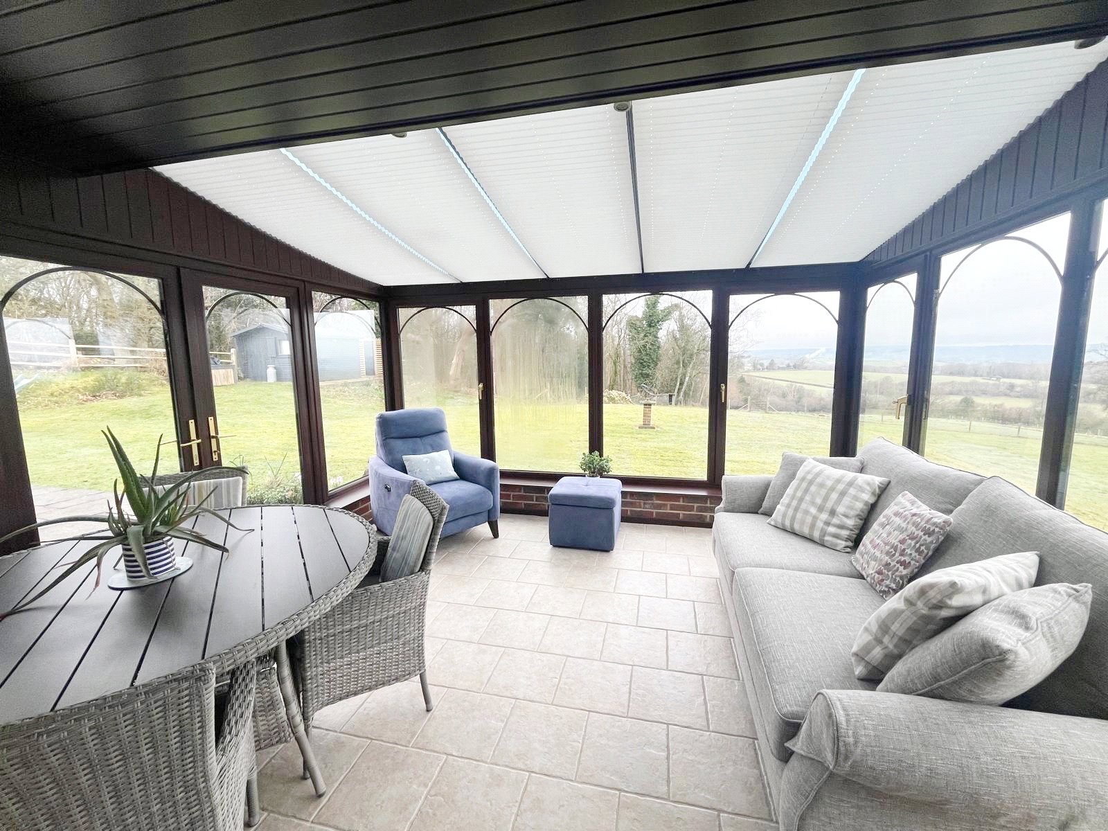 CONSERVATORY: A triple aspect room with tiled floors, low brick walls, glazed roof, double glazed sides and doors also leading out to the large rear gardens with views over the adjoining paddocks and woodland.
