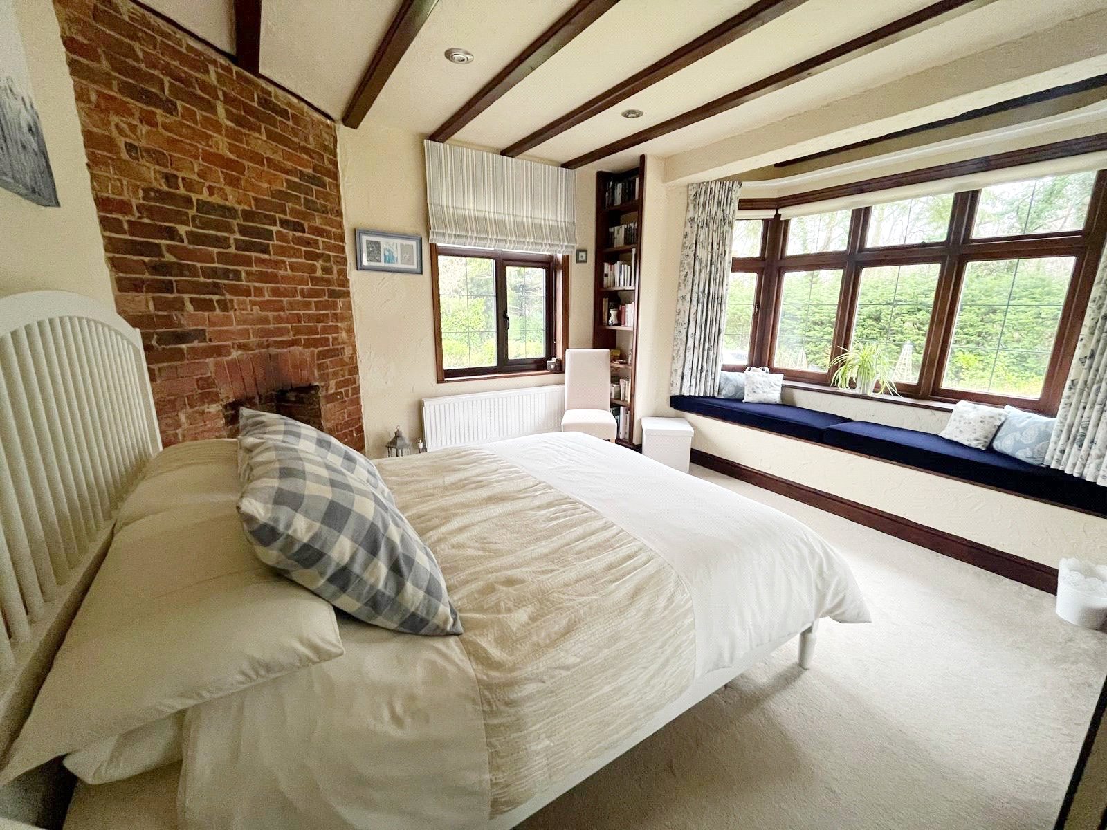 BEDROOM 4 (downstairs double room): A double aspect double sized bedroom with a feature brick fireplace, high level beamed ceiling, downlighting, fitted wardrobes, radiator, large double glazed bay window with window seat incorporated and having aspect over the front gardens, further double-glazed windows with aspect to the side gardens.