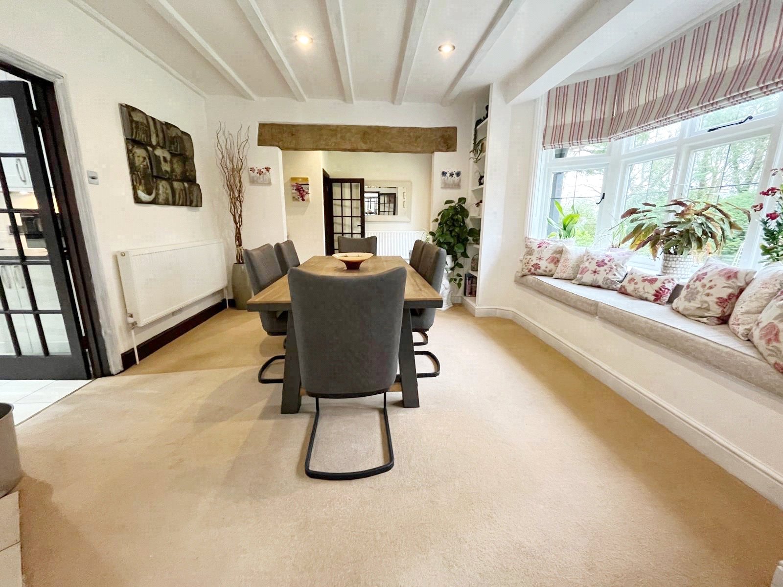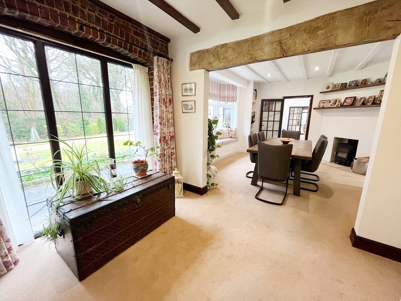 LARGE FORMAL DINING ROOM: Approached from the main reception hall and the kitchen / breakfast room, as well as from the inner rear hall. This naturally bright and spacious room has high level beams to the ceilings, as further feature central beam, downlighting, a feature fireplace with a fitted wood burner, a large double glazed bay window with window seat incorporated with attractive aspect over the front gardens, further large full height double glazed windows also with aspect over the front gardens, radiators and door leading to rear hall.