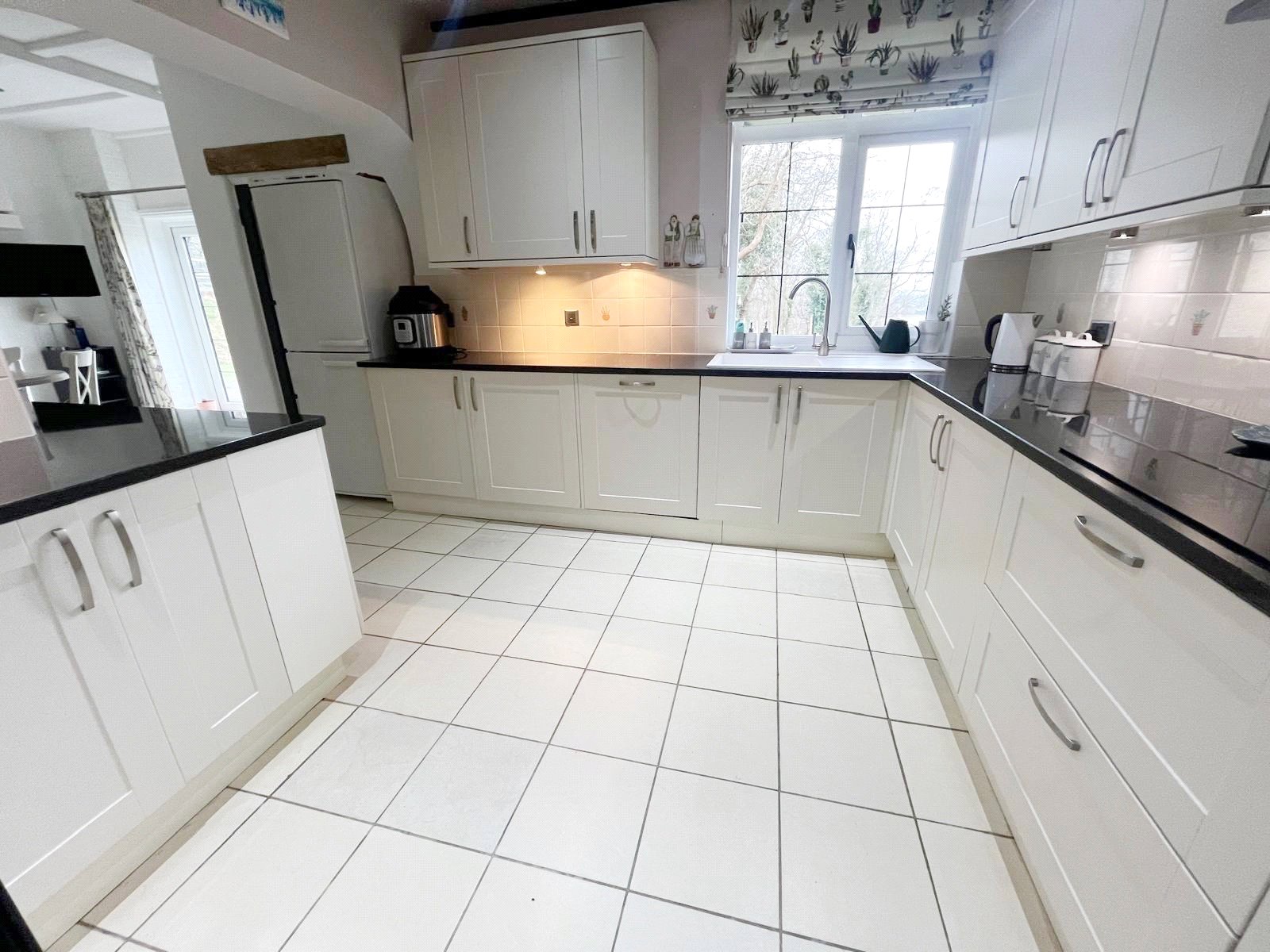 KITCHEN AREA: With an extensive range of attractive modern shaker cupboard and base units with granite worktops over, fitted glazed and steel oven and grill, further electric ceramic hob with stainless steel over, tiled surrounds, fitted sink with mixer tap and drainer, double glazed window with aspect over the rear gardens and beyond to stunning panoramic views of the adjoining countryside as far as the eye can see, space fridge freezer, wooden and glazed door to the formal dining room.