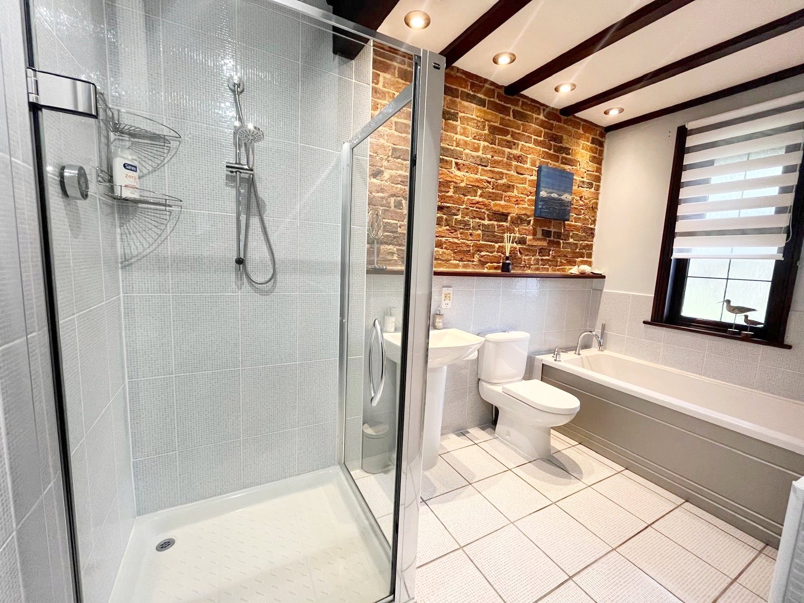 DOWNSTAIRS BATHROOM / SHOWER ROOM (2nd family bathroom facility also servicing bedroom 4): Comprising a fitted bath with chrome taps, shower attachment, WC, pedestal wash basin, chrome mixer tap, chrome heated towel rail, corner shower with glazed and chrome sides, tiled walls, chrome controls, feature exposed brick wall, radiator to wall, double glazed window.