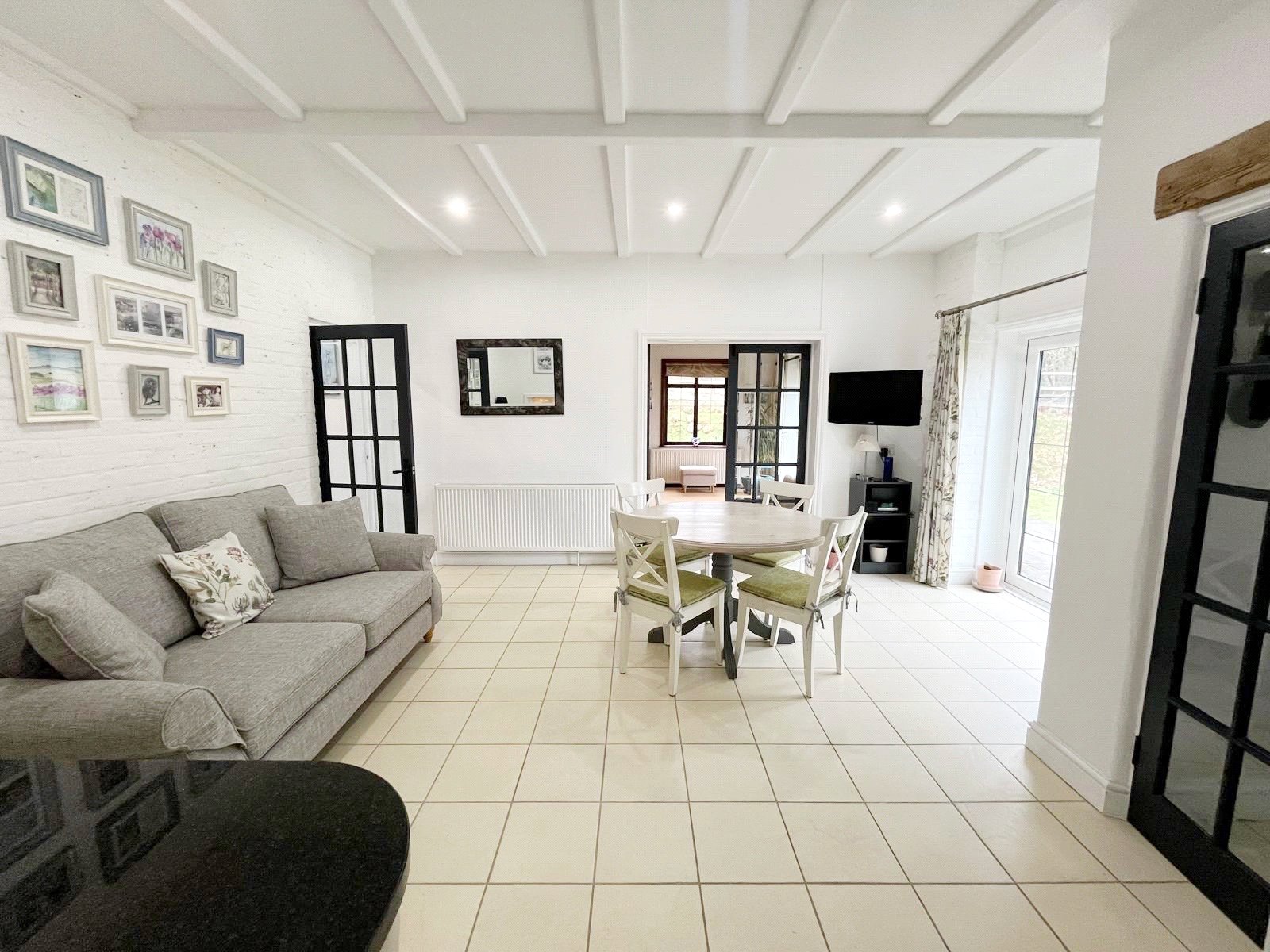 REAR HALL: With a beamed high-level ceiling, with a number of doors leading off to a family room / study, a downstairs double bedroom and a large bathroom / shower room.