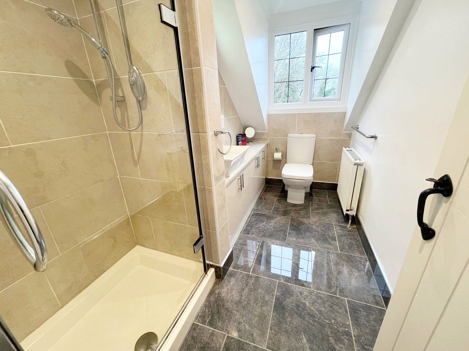 BEDROOM ONE LUXURY ENSUITE SHOWER ROOM: Comprising of tiled floors, radiator, WC, shower with heavy glazed front, shower control systems, beamed ceiling down lighting, vanity cupboards, wash basin, double glazed windows.