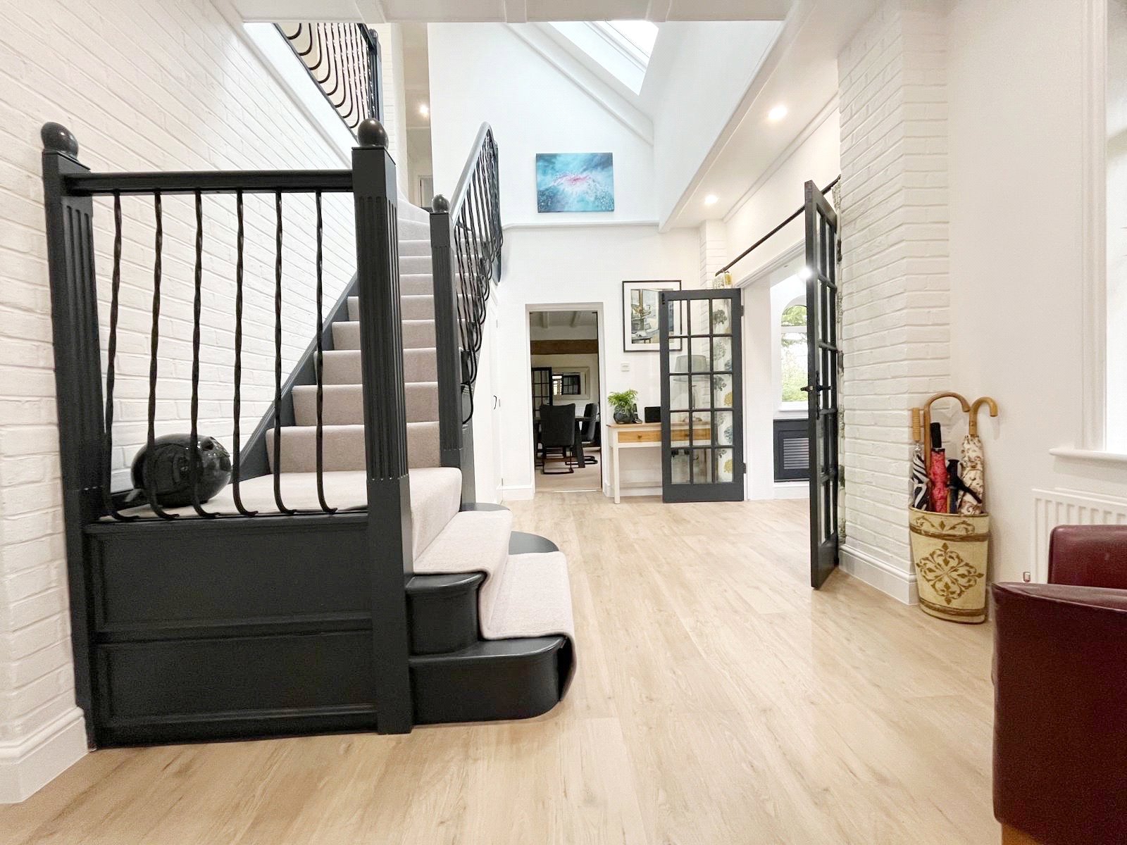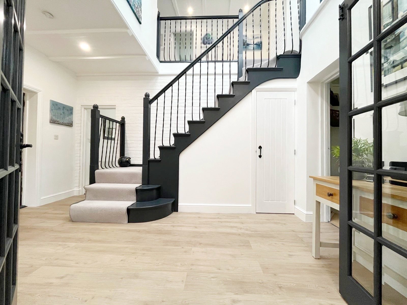MAIN RECEPTION HALL: A naturally bright and spacious hall with a vaulted ceiling and attractive galleried landing above, under stairs storage cupboard, downlighting, radiator, double glazed window with aspect to the front gardens, doors leading off from the main reception hall to a sitting room, a formal dining room and a kitchen / breakfast room, as well as a feature metal staircase leading to the first-floor accommodation.