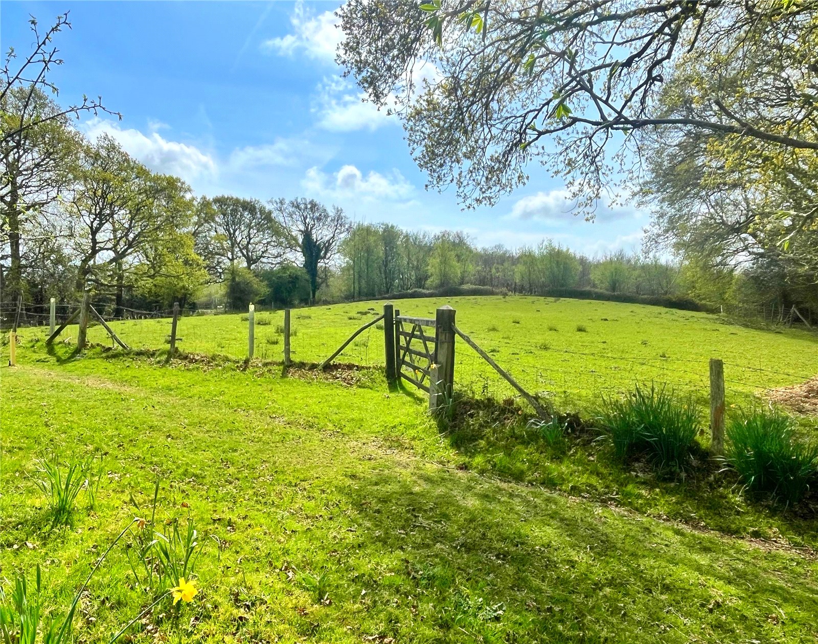 SIDE PADDOCK: As you come off Newick Lane before the property’s entrance gates, there is a large grazing paddock to the left and an access track leading to the further paddocks and woodland behind the property. The side paddock is accessed off the is track by a five-bar wooden gate and comprises of grazing land with a fenced boundary and woodland to its rear.