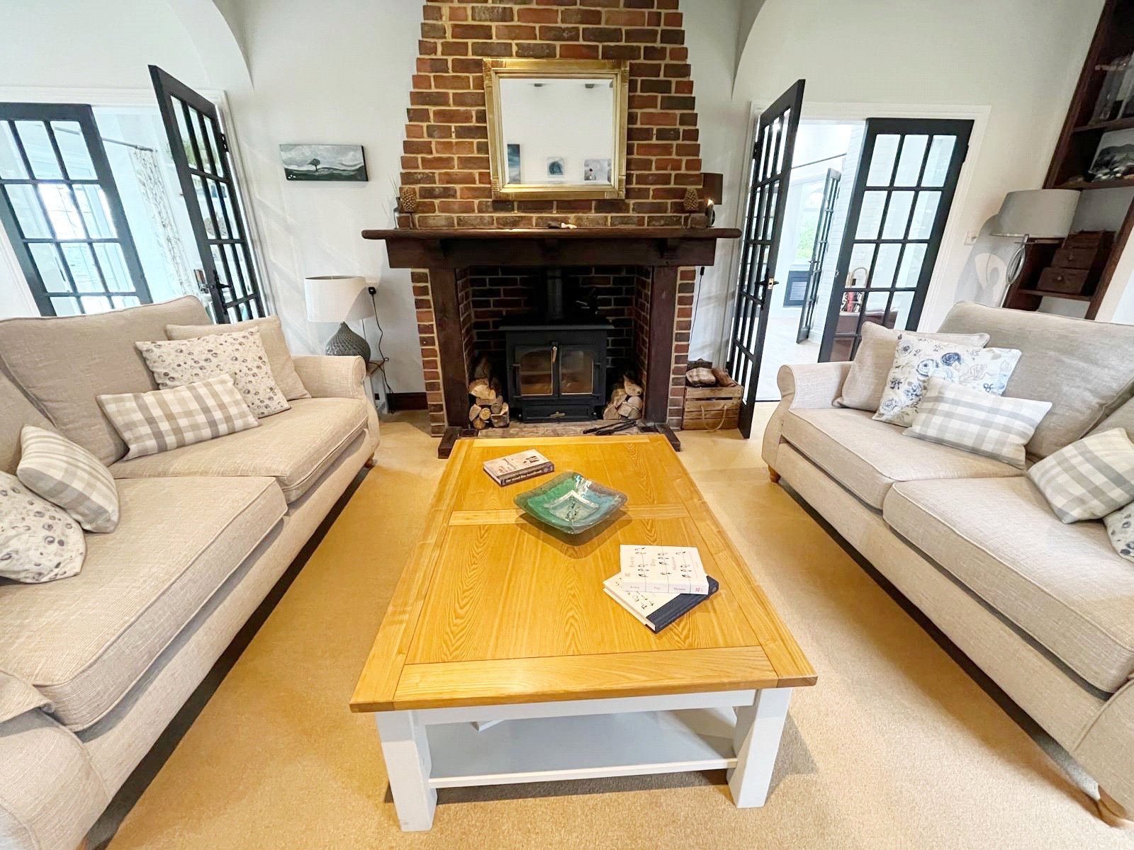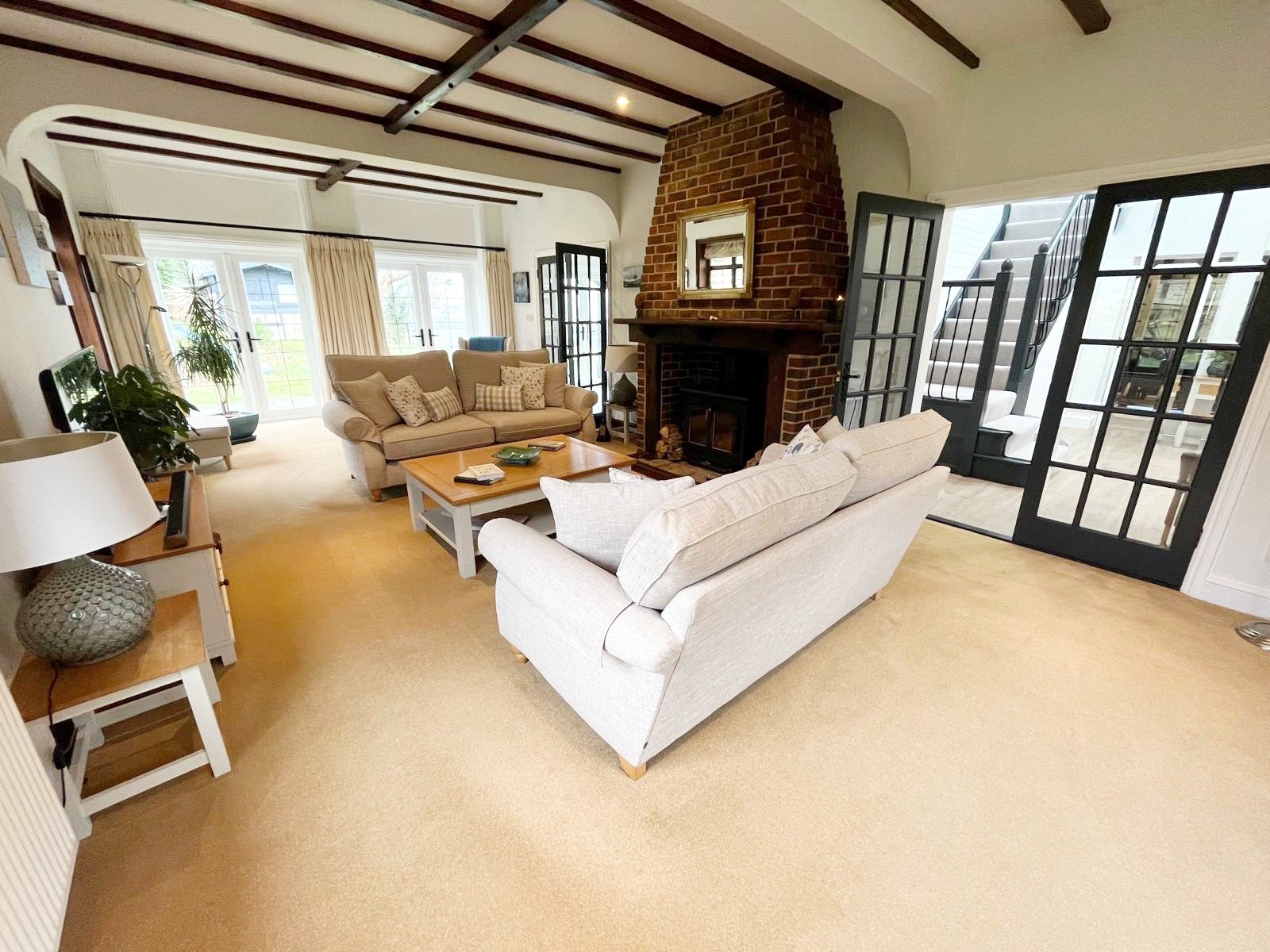 SITTING ROOM: Approached from the main reception hall through a pair of glazed and paned doors, as well as from the kitchen / breakfast room. This room is triple aspect with a fabulous brick inglenook fireplace with a fitted wood burner and oak surround and brick hearth, high level beamed ceilings, downlighting, radiators, double glazed windows with aspect to the side gardens and front gardens, as well as double glazed windows and doors to the rear gardens with wonderful views beyond, twin doors opening to the kitchen / breakfast room.