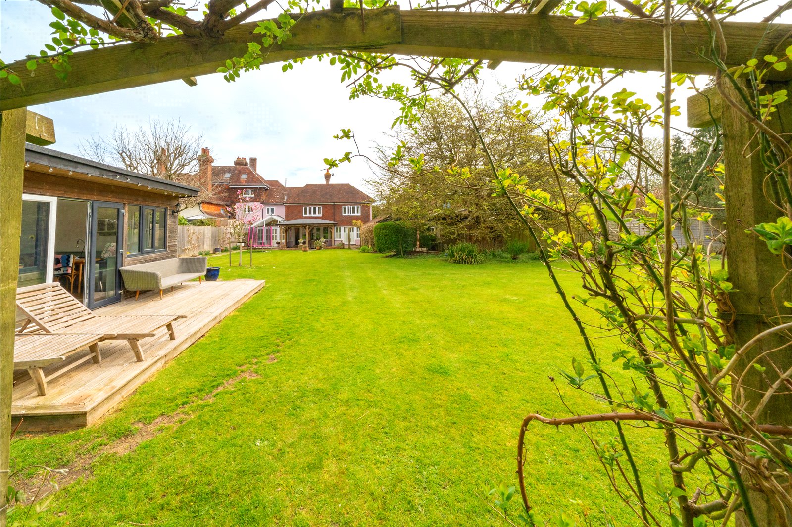 The garden provides ample space for children’s play and recreation, with open lawn areas and a more natural, wildlife-friendly section beyond. From the upper levels and garden itself, there are uninterrupted rural views over neighbouring fields and rolling countryside.