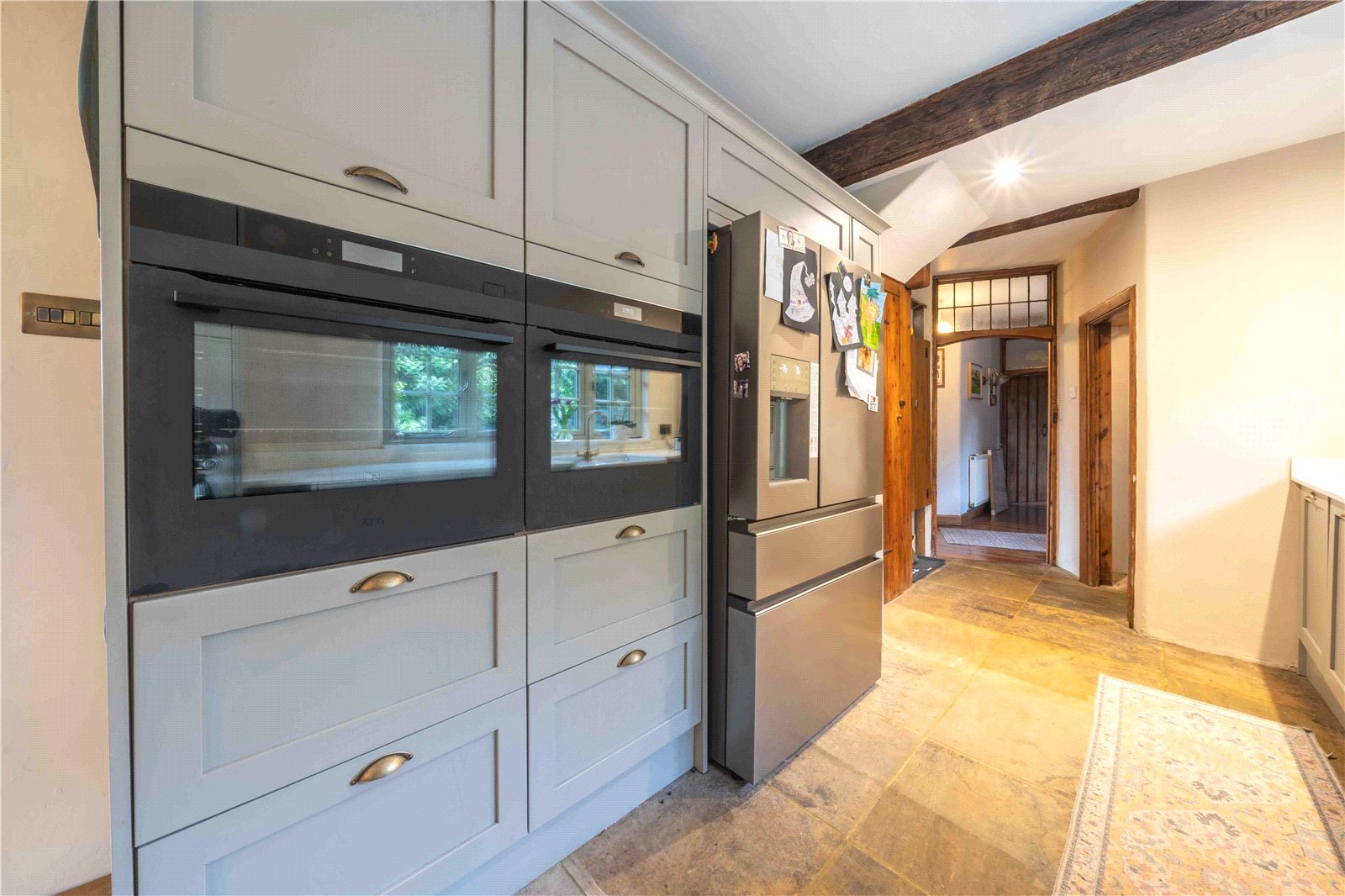The kitchen itself is fitted with an extensive range of bespoke shaker-style cabinetry, complemented by stone work surfaces and a classic Belfast sink positioned beneath a wide window overlooking the gardens. Integrated AEG double ovens are set within a tall housing unit, alongside space for an American-style fridge/freezer. A generous central island provides additional preparation space, incorporating further storage and a built-in wine fridge, making it both a practical workspace and an ideal social hub.