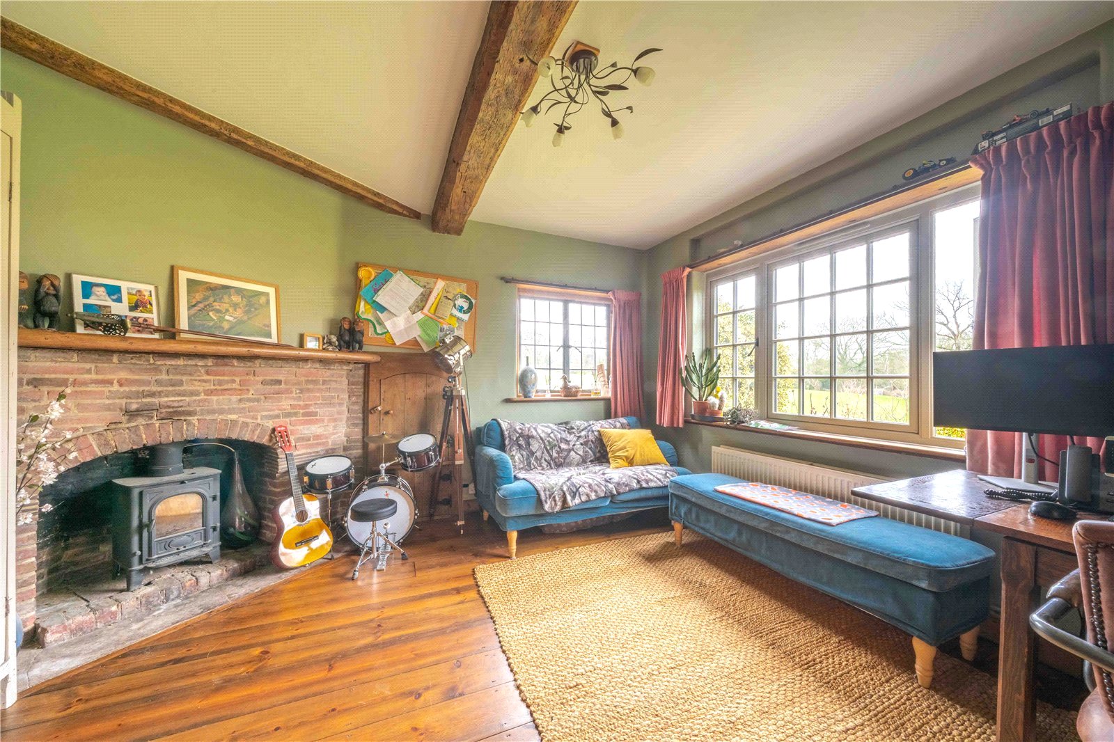 • Characterful dual-aspect sitting room with exposed beams, solid wood flooring and brick fireplace with inset wood-burning stove.