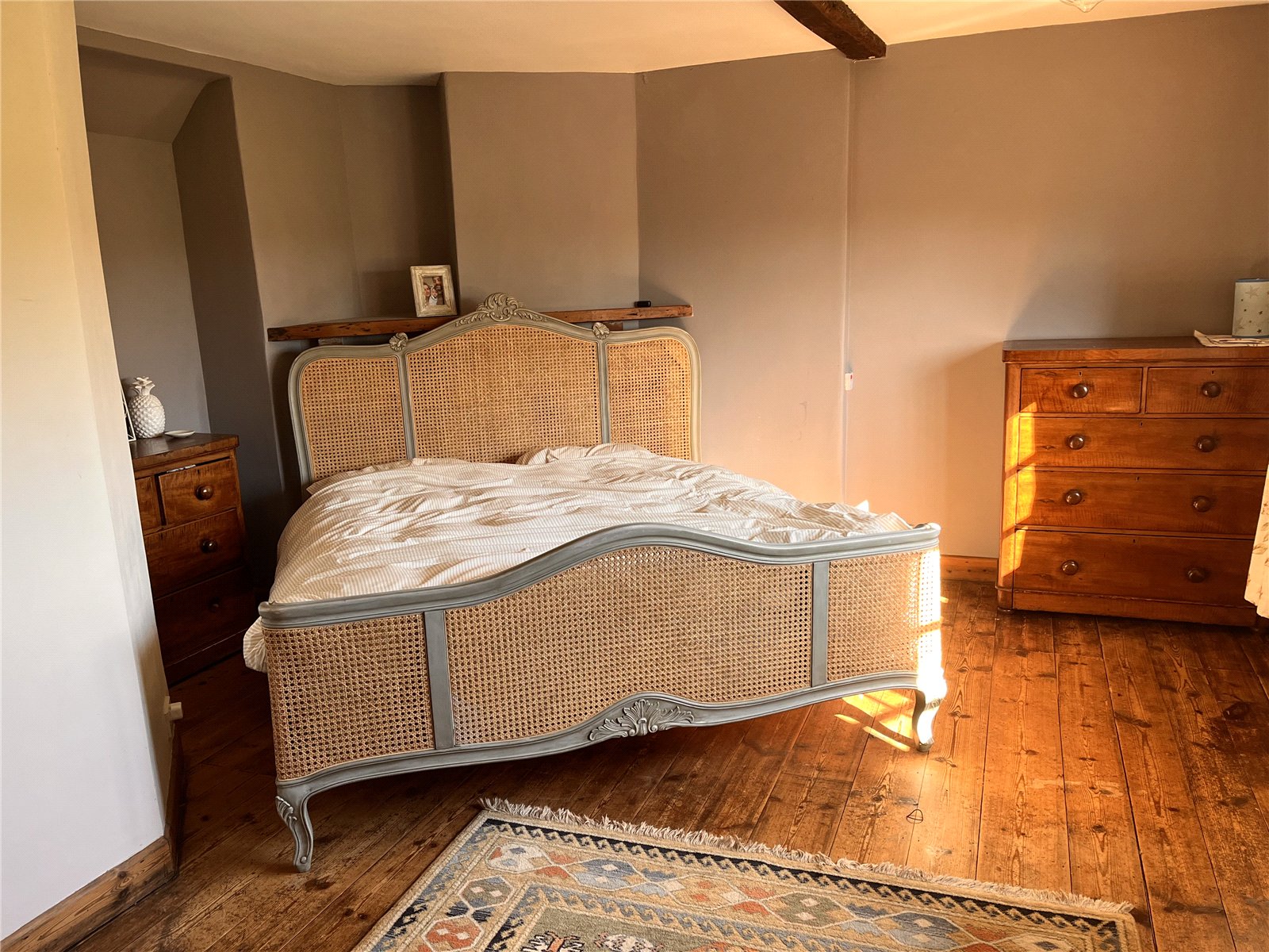 A solid timber latch door adds further character, and there is useful storage provided within the room. Altogether, a cosy yet spacious bedroom blending period charm with everyday practicality.