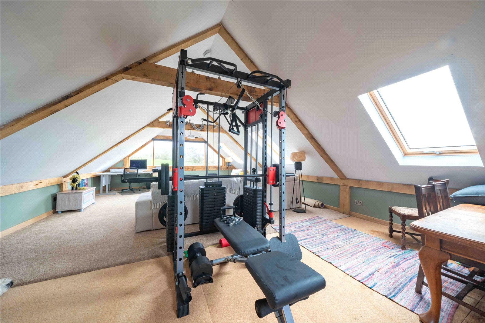 GYM/GAMES ROOM: An impressive and exceptionally spacious loft-style gym and games room, occupying the upper floor and offering outstanding versatility.