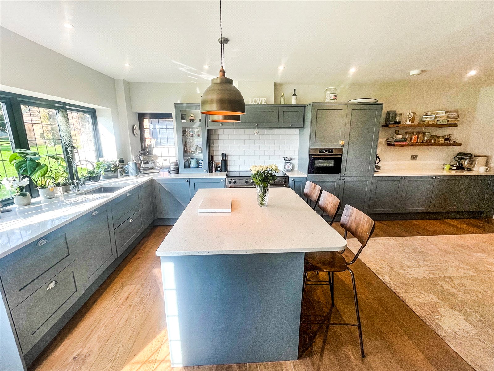 KITCHEN / BREAKFAST ROOM: A large triple aspect room that can be approached from the inner hall, the sitting room, as well as from the rear garden through a double-glazed door. This naturally bright room has oak floor, under floor heating, downlighting, an extensive and luxurious range of modern Shaker style cupboard and base units including the bespoke display cabinets, stone worktops, twin feature lights above central island and breakfast bar, cooking range with tiled surround, hood over, fitted oven, space for American style fridge freezer, dishwasher, fitted sink unit with mixer tap, double glazed windows with aspect over the rear garden.