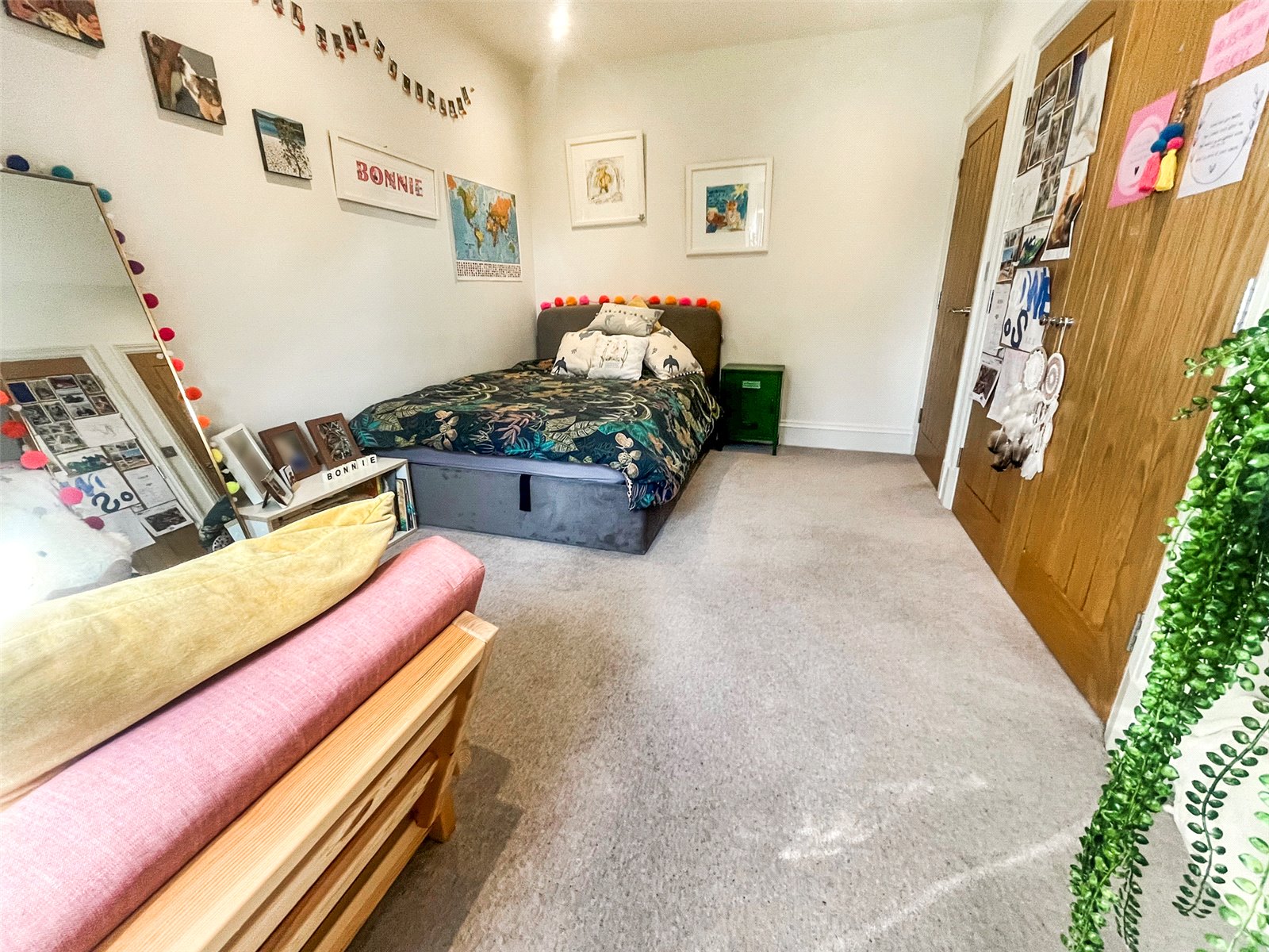 BEDROOM FIVE: A double sized room with vintage radiator, fitted double wardrobe cupboard, down lighting, double glazed window with aspect over the front gardens.