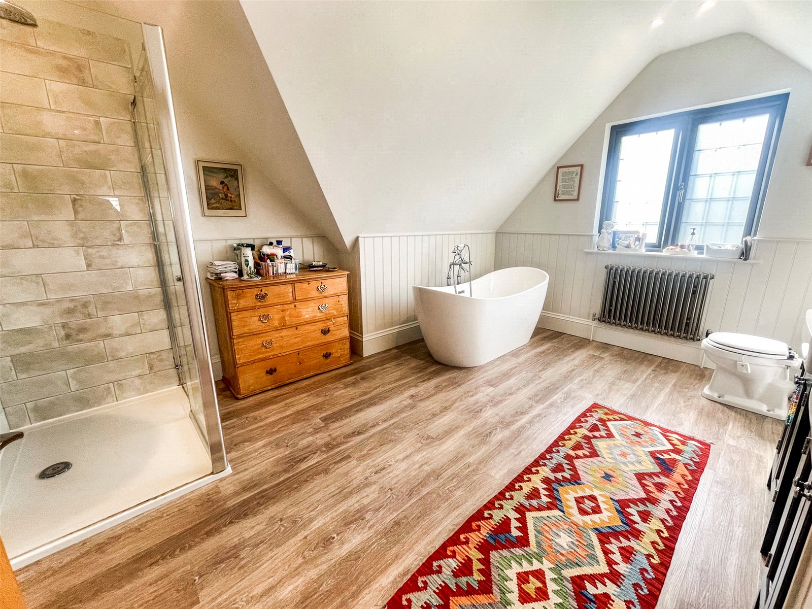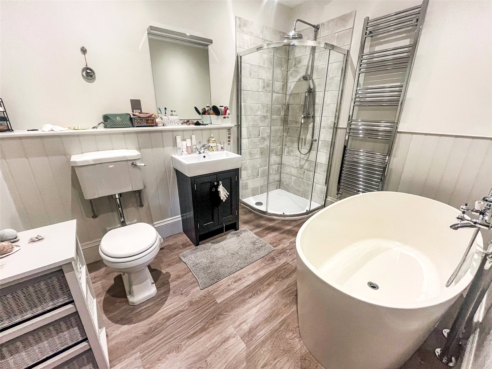BEDROOM ONE ENSUITE BATHROOM / SHOWER ROOM: Comprising of wood effect waterproof flooring, feature oval bath with chrome mixer tap, half panelled walls, W.C., twin feature sinks with chrome mixer taps and matching Shaker style vanity units under, large landscape wall mirror over, separate double sized shower with heavy glazed sides, chrome shower control system, tiled walls, vintage radiator, downlighting, double glazed window, chrome heated towel rail.