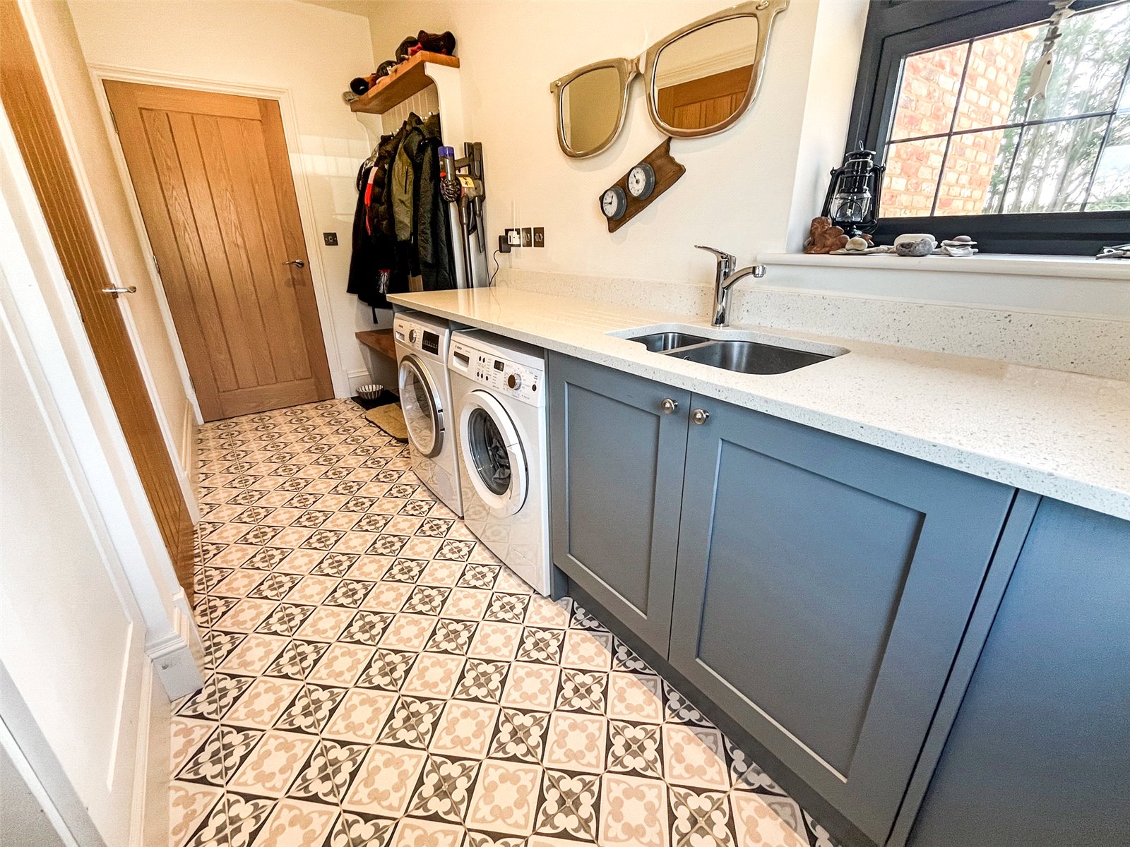 UTILITY ROOM: Comprising of tiled floors, range of Shaker style base units with stonework surfaces over, inset stainless sinks, chrome mixer tap, floor boiler, coats and boots storage area, door to cupboard, double glazed window with aspect to rear garden, double glazed window with aspect to front garden, double glazed door to driveway.