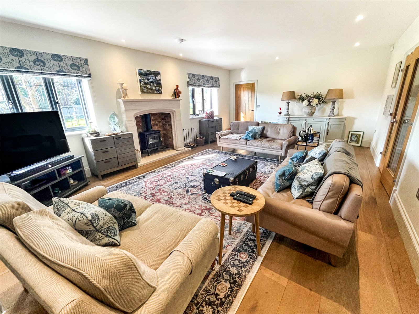 SITTING ROOM: A large naturally bright double aspect room with a splendid feature gothic style stone fireplace with fitted wood burner, oak floors, under floor heating, double glazed doors to the side sun terrace and garden with fabulous far reaching rural views beyond, to further double-glazed windows with aspect over the rear gardens, downlighting, oak door to kitchen / breakfast room.