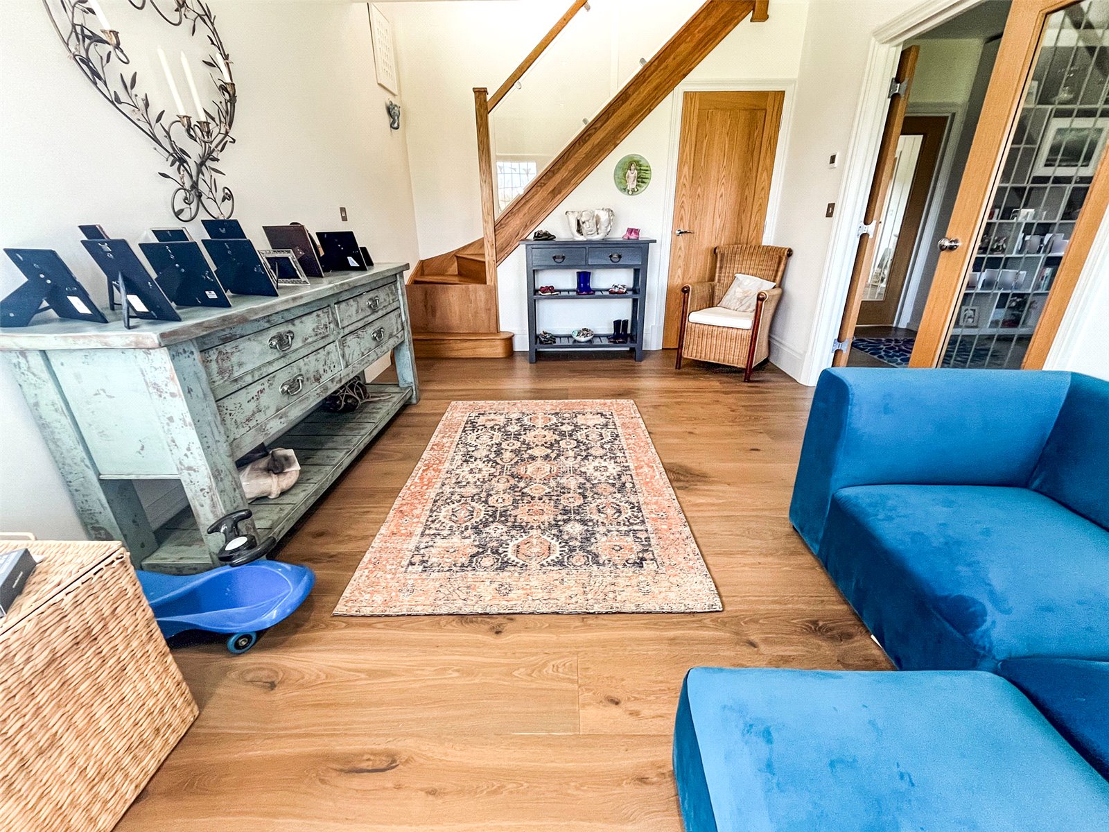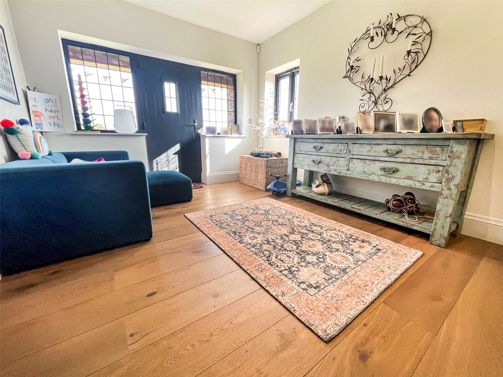 MAIN RECEPTION HALL: Comprising of oak floors, under floor heating, oak door to under stairs storage, oak staircase leading to the first-floor accommodation, double glazed leaded light windows with aspect to front with beautiful far-reaching views beyond, twin oak and glazed doors leading to the adjoining formal dining room.