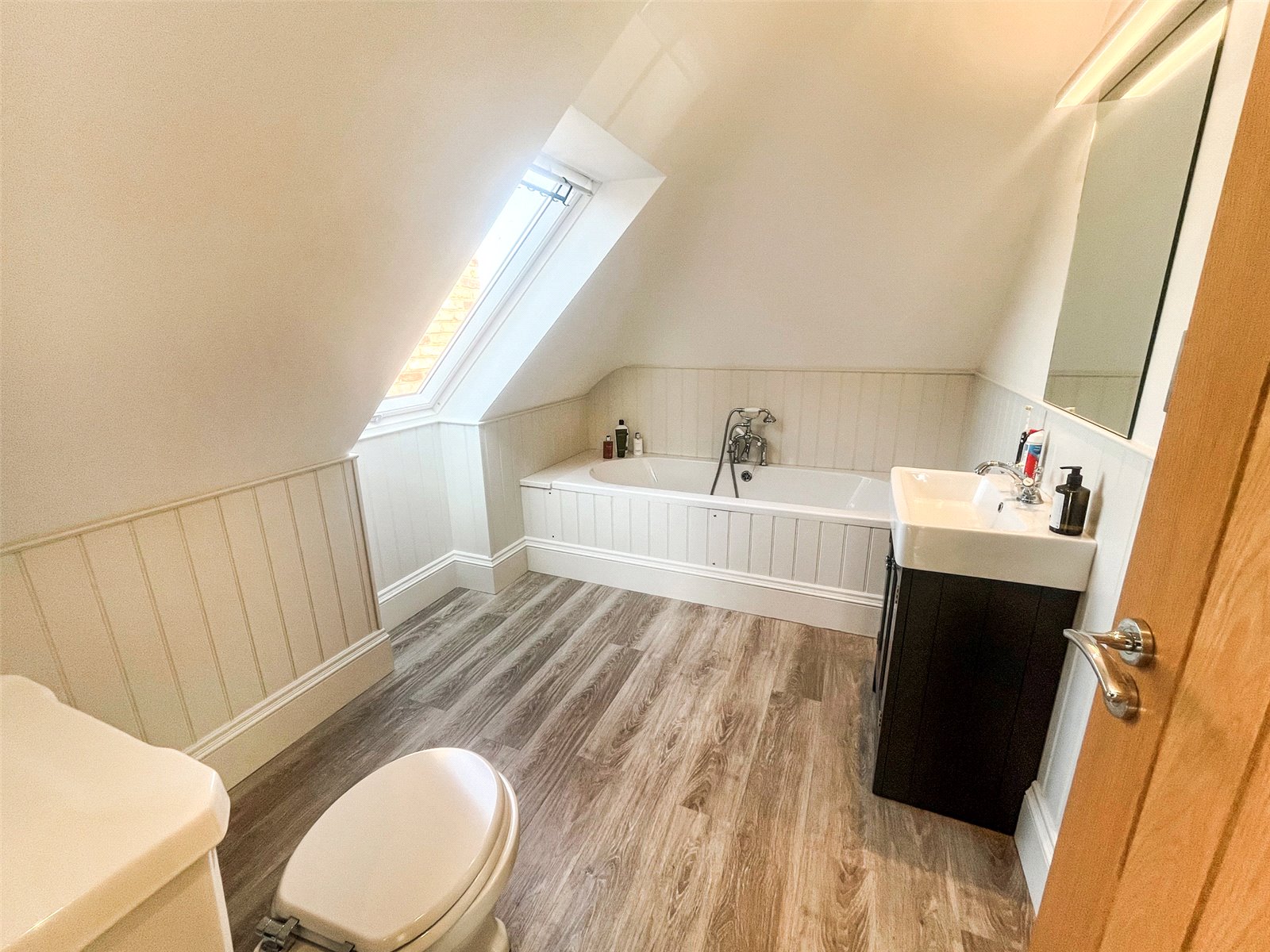 2ND FLOOR LUXURY FAMILY BATHROOM / SHOWER ROOM: Comprising of a W.C., wash basin with chrome tap and Shaker style vanity unit under, fitted panelled bath, chrome mixer tap with shower attachment, cottage style panelled walls, chrome heated towel rail, double glazed window with rural views.