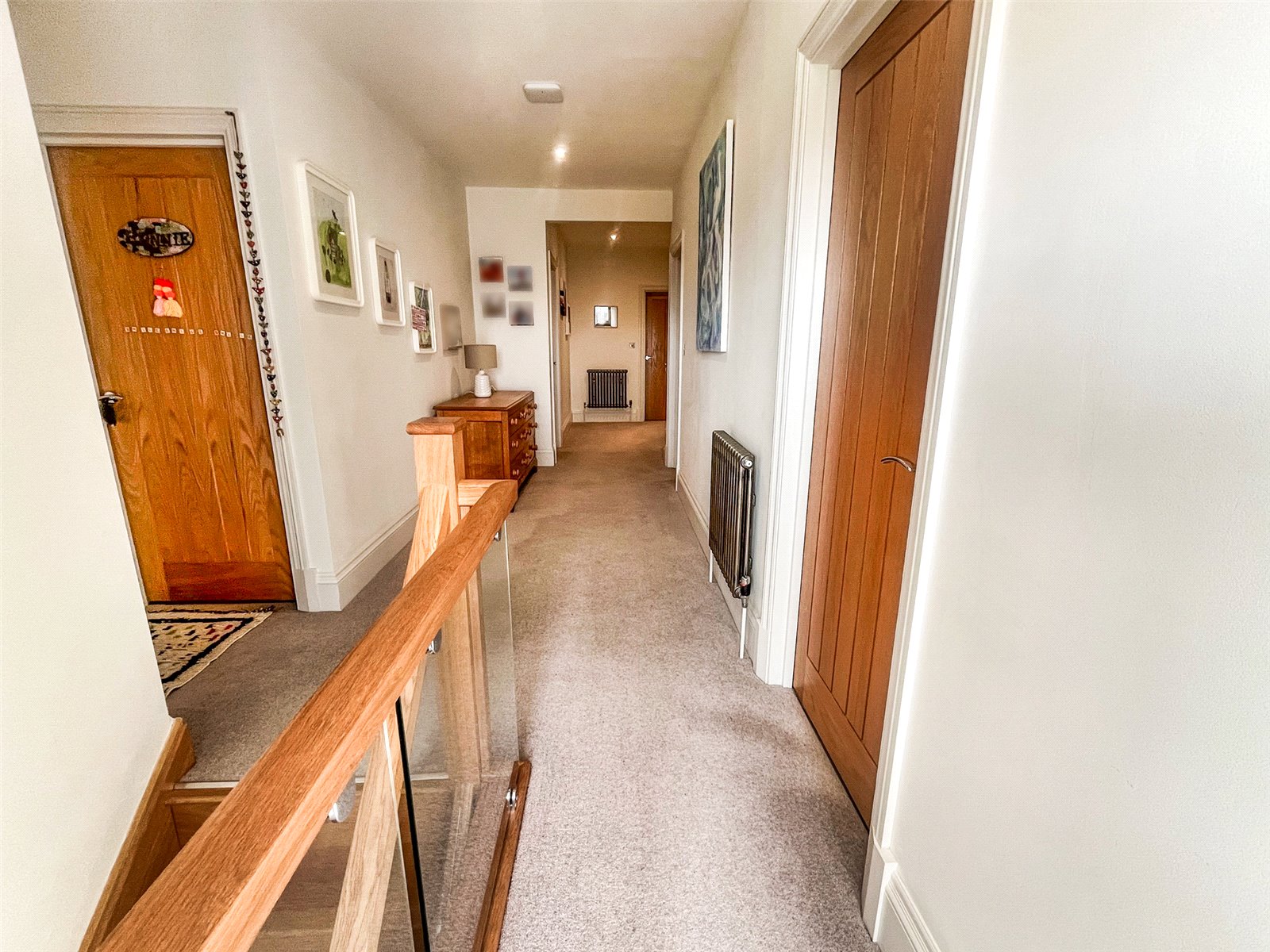 FIRST FLOOR LANDING: Comprising of a carpeted floor with vintage character radiators, airing cupboard, oak doors leading off to bedrooms, 1,2,3,4,5 and to the first-floor luxury family bathroom / shower room, further feature oak and glazed staircase leading to the second-floor accommodation, double glazed window with absolutely stunning views of the surrounding countryside.