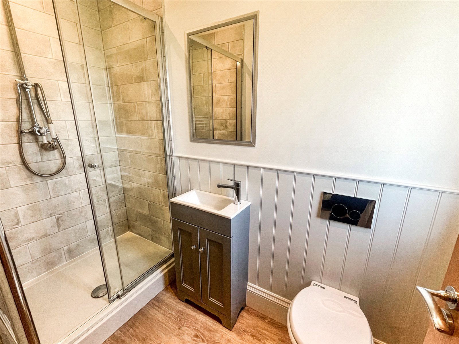 ENSUITE LUXURY SHOWER ROOM: Comprising of W.C., chrome flush, radiator / towel rail, wash basin with chrome mixer tap, Shaker style vanity unit under, double sized shower with heavy glazed front, tiled walls, half panelled walls, downlighting, wood effect waterproof flooring, double glazed window.