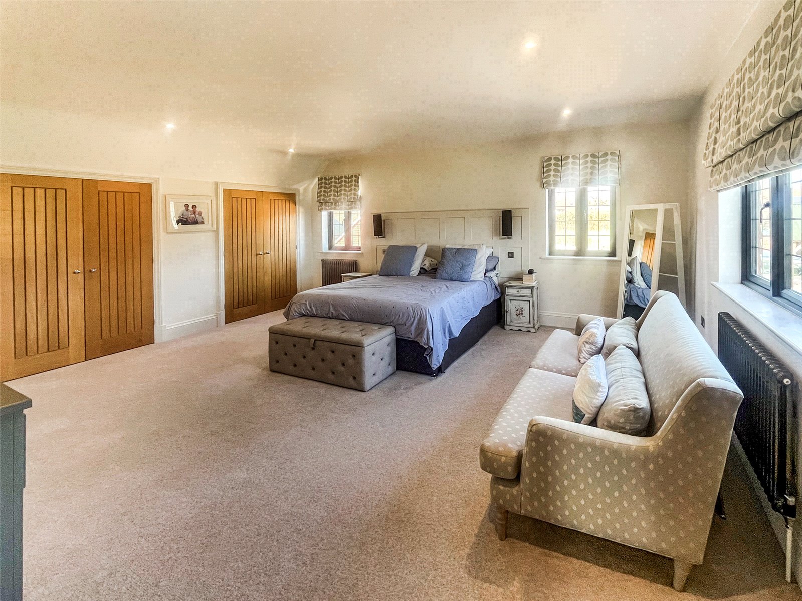 BEDROOM ONE MAIN SUITE WITH LARGE LUXURIOUS BATHROOM / SHOWER ROOM: Comprising of a generous sized double aspect and double sized bedroom with lounging area, carpeted floors, vintage radiators, downlighting, twin fitted oak fronted wardrobes, double glazed windows with aspect over the front driveways, further double-glazed window with aspect to the front gardens and also beyond of the stunning rural views as a far as the eye can see. Door to large luxury ensuite bathroom / shower room.