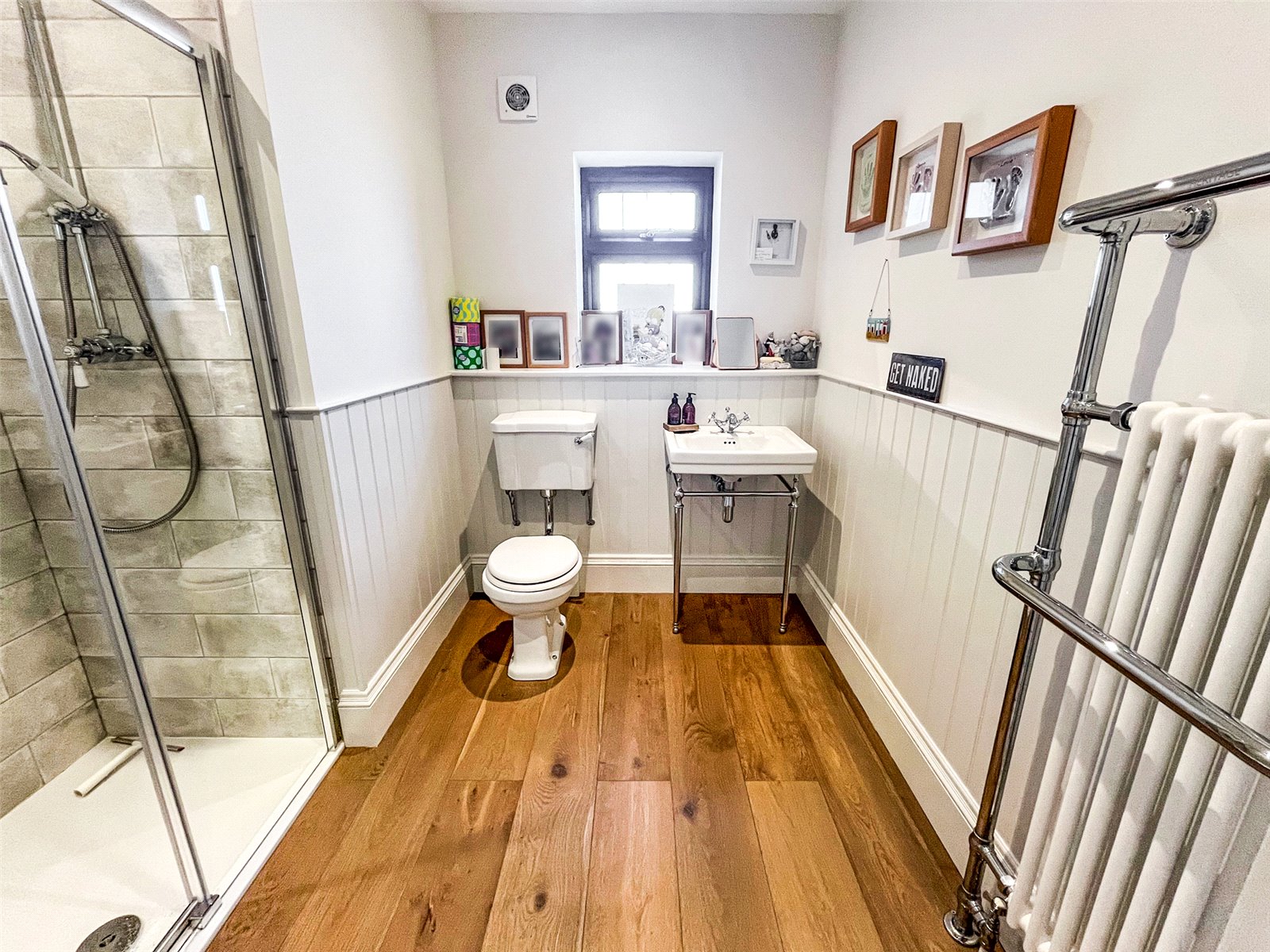 CLOAKROOM / SHOWER ROOM: Comprising of oak floors, vintage style radiator / towel rail, W.C., wash basin with chrome supports, chrome mixer tap, half level cottage style panelling, double sized heavy glazed shower with tiled walls, chrome shower control system, extractor fan.