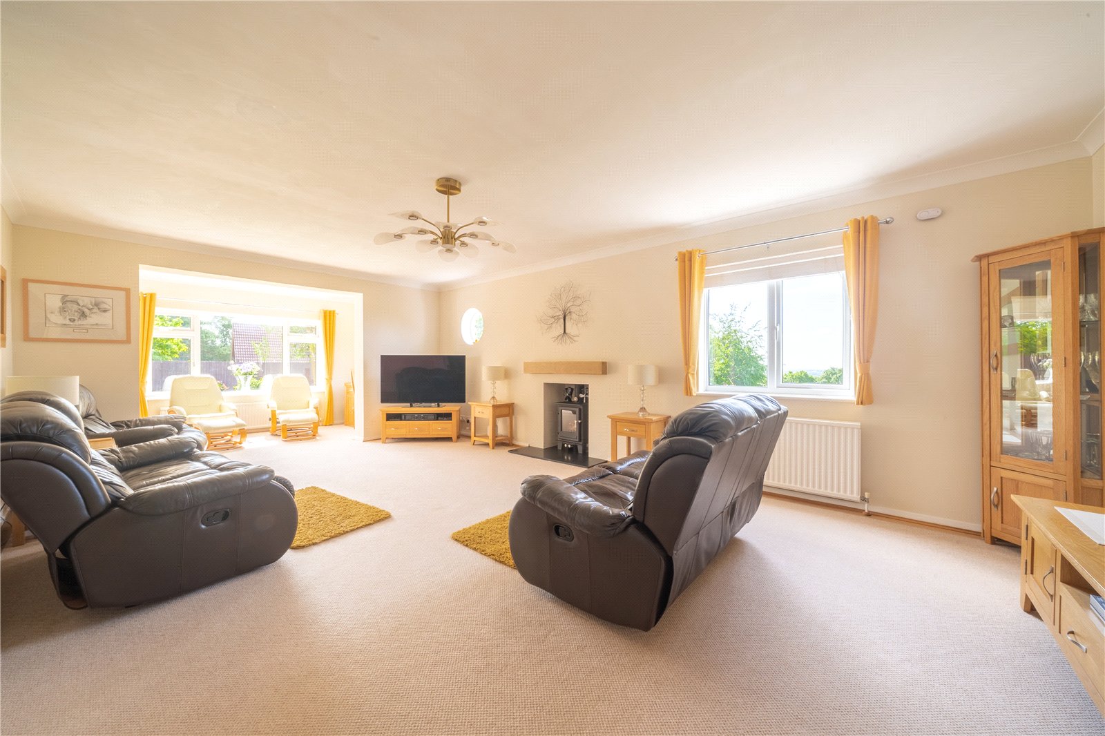 LIVING ROOM: The spacious living room is a key feature of the home, offering a warm and comfortable atmosphere. The room benefits from a double aspect, allowing natural light to flood the space. A feature wood burner serves as a cozy focal point, perfect for both relaxing and entertaining. The large windows offer pleasant views of the garden and surrounding countryside.