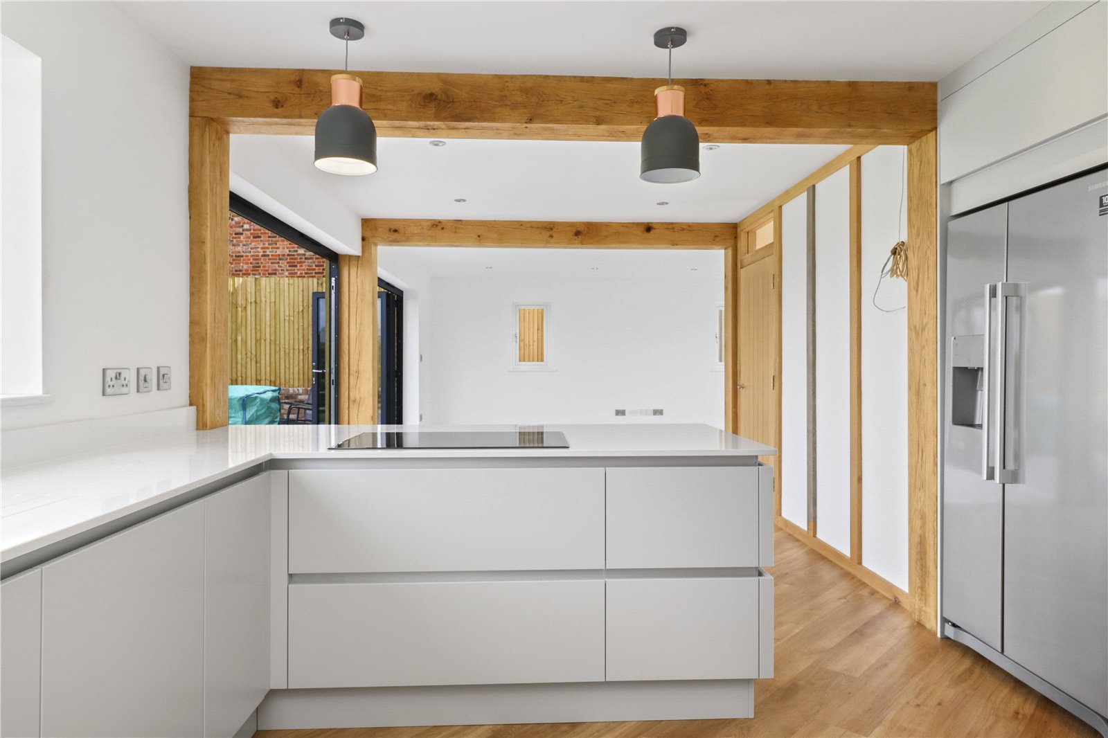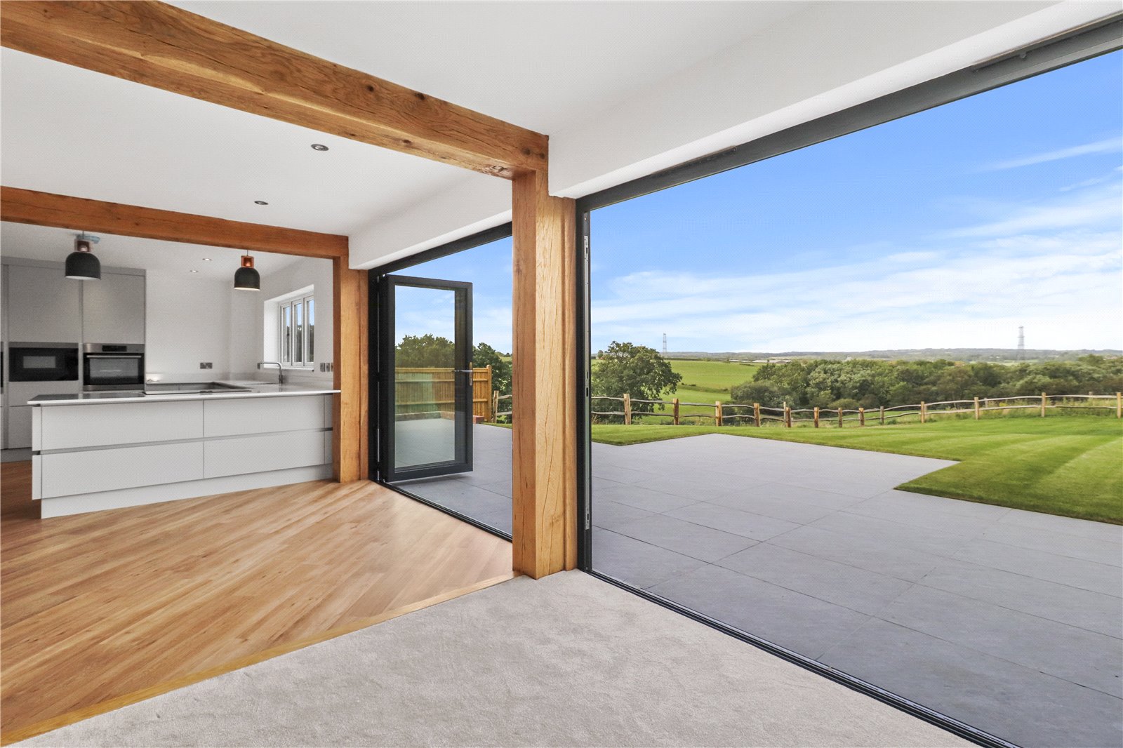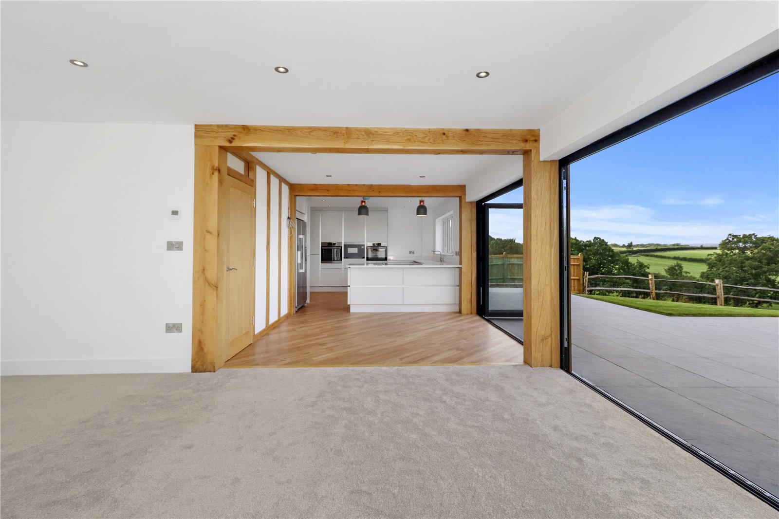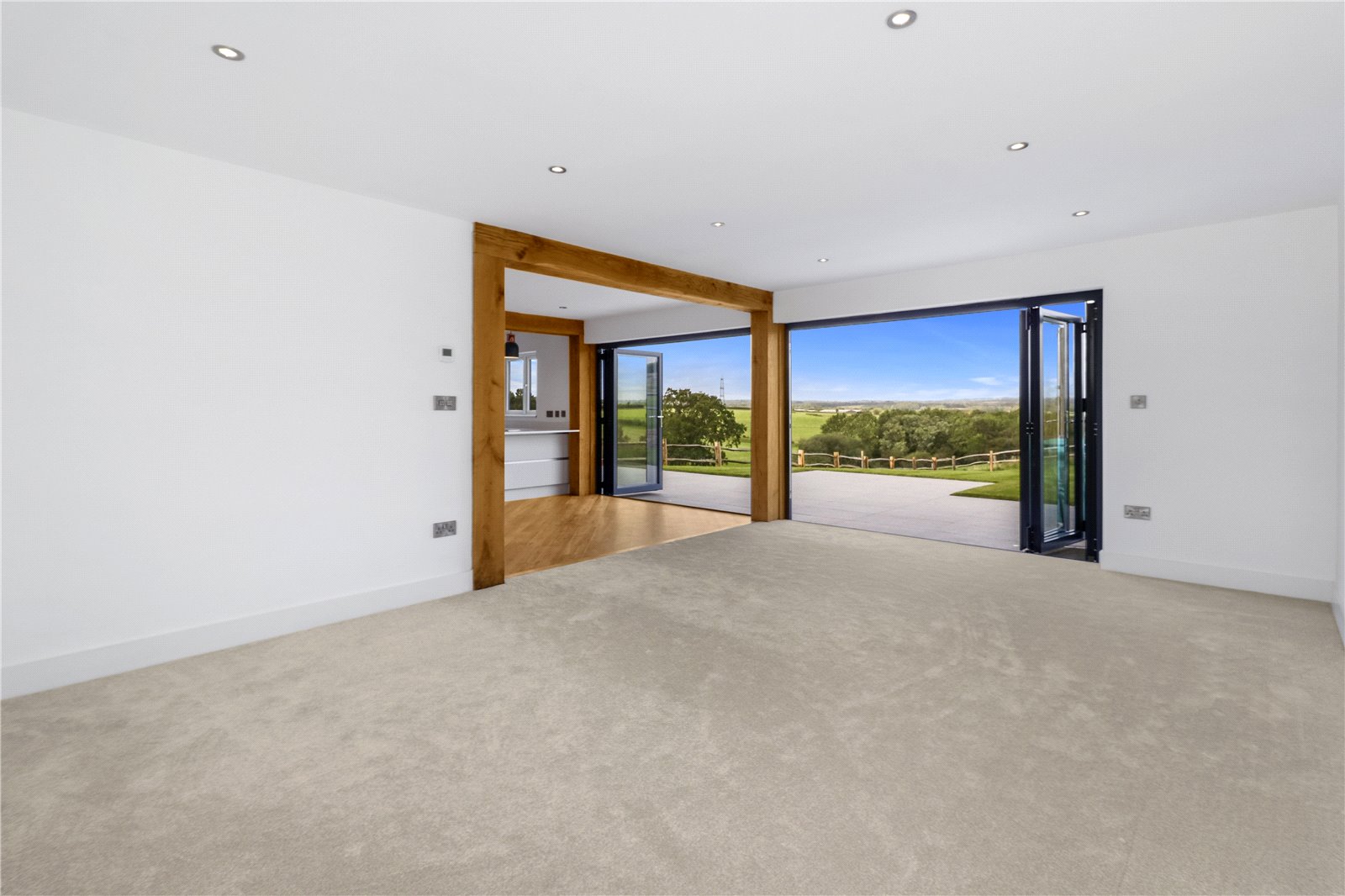 OPEN PLAN DINING HALL: 12 FEET X 11 FEET 5 INCHES. A large open plan area with a continuation of the attractive Amtico influenced light oak coloured wood effect parquet flooring with feature exposed wooden beams, underfloor heating, fabulous full height and width double glazed powder coated bi-folding picture window doors opening onto the adjoining sun terrace and the 108 Foot rear garden backing onto farmland with beautiful far reaching rural views beyond.