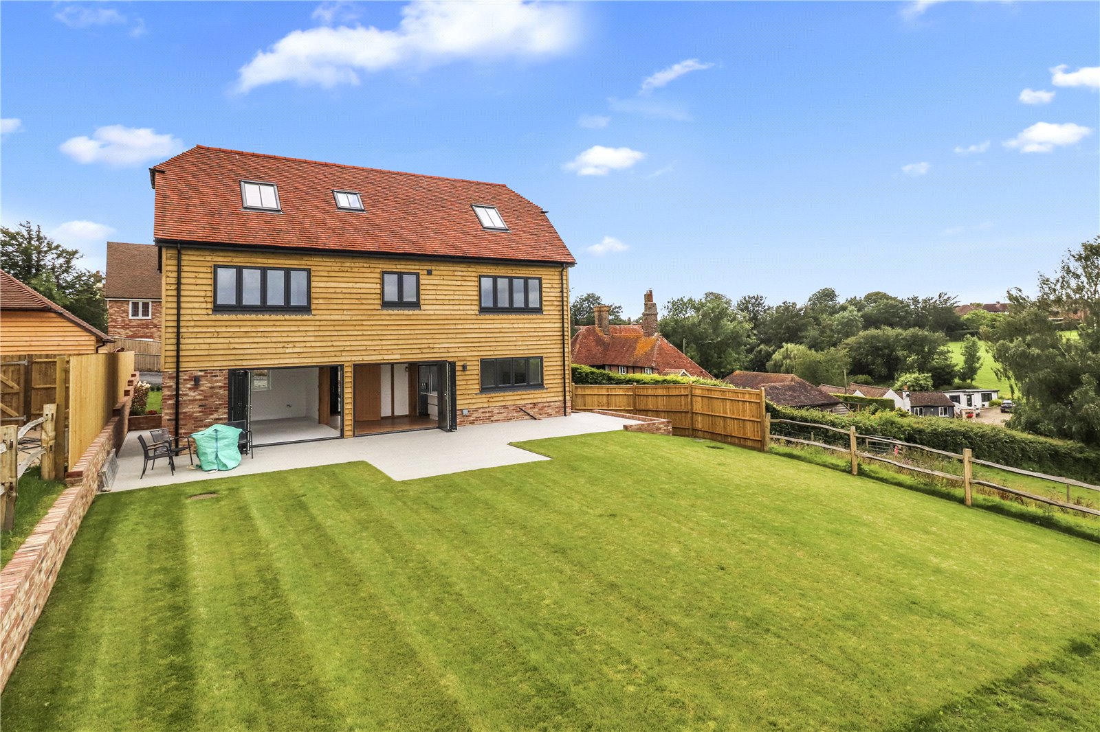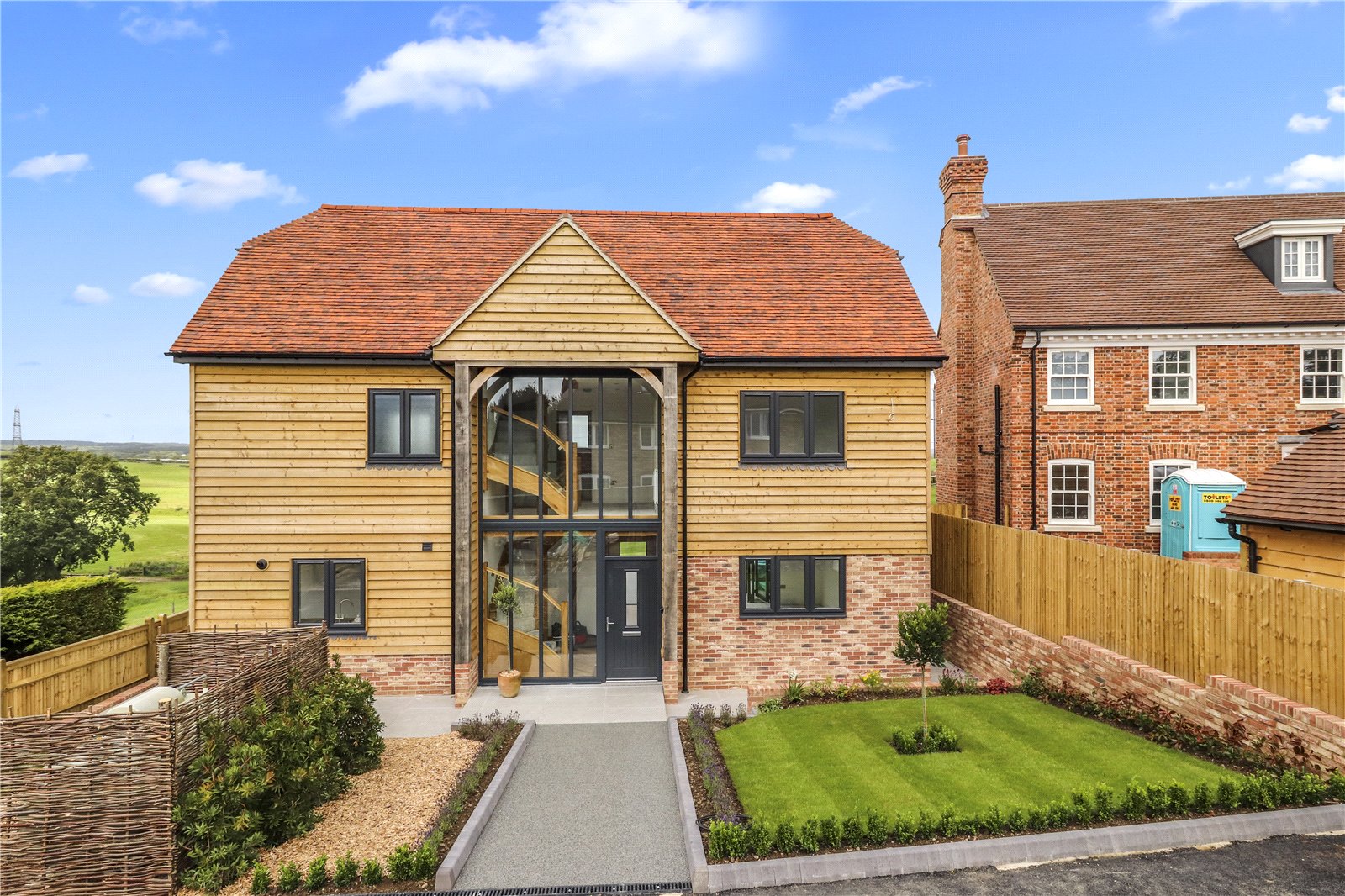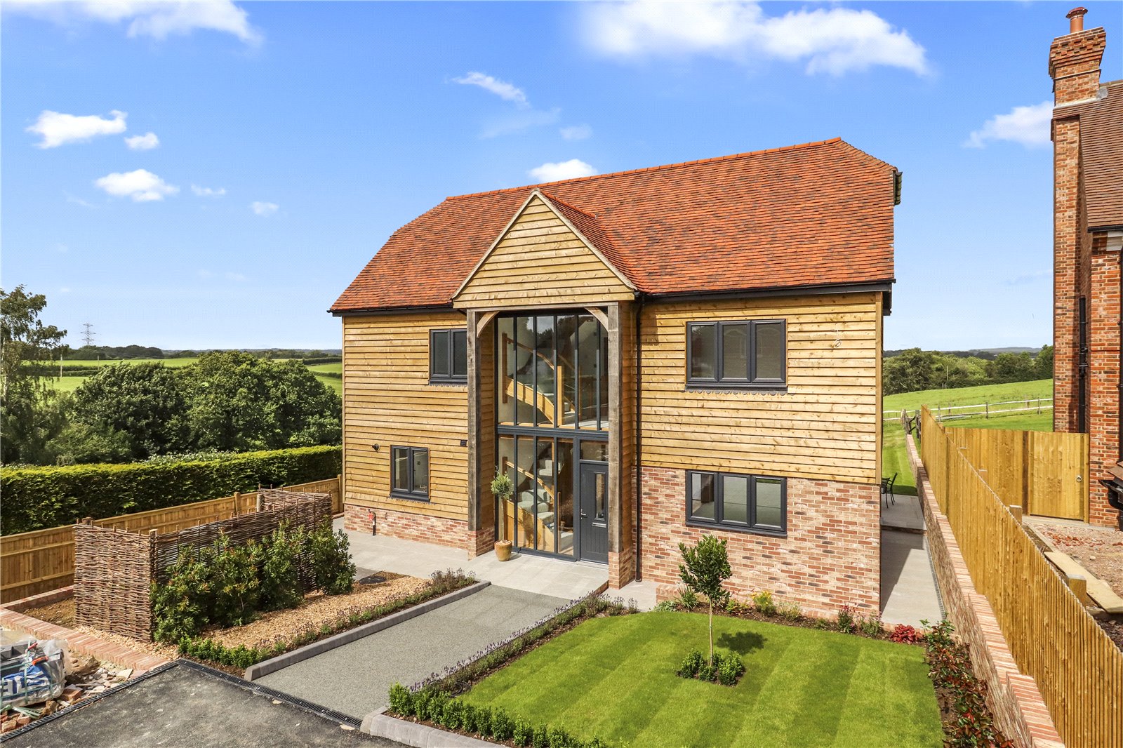 MAIN SPECIFICATIONS: A RARE OPPORTUNITY TO PURCHASE A SUBSTANTIAL SIZED NEW BUILD ELEGANT CONTEMPORARY ARCHITECT DESIGNED THREE STOREY DETACHED FIVE BEDROOMED BESPOKE EXCLUSIVE VILLAGE FAMILY RESIDENCE WITH BEAUTIFUL RURAL VIEWS OF ADJOINING COUNTRY SIDE * APPROXIMATELY A 108 FOOT REAR GARDEN BACKING ONTO OPEN FARMLAND * PRIVATE ELECTRIC ENTRY GATES * HIGH SPECIFICATION RESIN BONDED GRAVEL DRIVEWAY WITH TURNING AND PARKING AREAS * IN ADDITION THERE IS A DETACHED HERITAGE STYLE GARAGE * IMPRESSIVE CONTEMPORARY RECEPTION HALL * HIGH SPECIFICATION KITCHEN / BREAKFAST ROOM * SEPARATE UTILTY ROOM * DOWNSTAIRS CLOAKROOM * OPEN PLAN DINING HALL * OPEN PLAN SITTING ROOM * UNDERFLOOR HEATING * FIRST AND SECOND FLOOR LANDINGS * CONTEMPORARY OAK AND HEAVY GLAZED STAIRCASES AND LANDINGS * FIVE DOUBLE BEDROOMS * MAIN BEDROOM ONE SUITE WITH BOTH ENSUITE SHOWER ROOM AND ENSUITE WALK IN DRESSING ROOM * TWO FURTHER FAMILY BATHROOMS / SHOWER ROOMS * POWDER COATED DOUBLE GLAZED WINDOWS * WONDERFUL FAR REACHING RURAL VIEWS FROM VIRTUALLY EVERY ROOM * A COMPLIMENTARY MIX OF DESIGN OF COMBINING A SUSSEX BARN STYLE BUILD AND TODAY’S MODERN OPEN PLAN STYLE OF LIVING ENHANCED BY A BEAUTIFUL SEMI RURAL VILLAGE SETTING BACKING ONTO OPEN COUNTRYSIDE * CURRENT SIZE OF ACCOMMODATION IS APPROXIMATELY 2,600 SQUARE FEET WITH AMPLE 108 FOOT REAR GARDEN TO EXTEND THE PROPERTY FURTHER IF REQUIRED SUBJECT TO PLANNING.