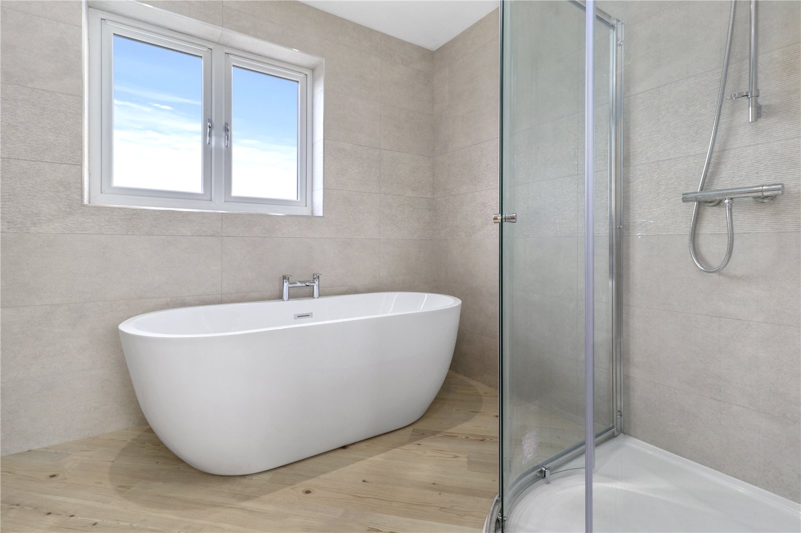 FIRST FLOOR FAMILY BATHROOM / SHOWER ROOM: 8 Feet x 7 Feet 6 Inches. Comprising of a panelled bath with chrome taps and tiled surrounds, a separate heavy glazed fronted shower cubicle with chrome shower control system, W.C. chrome heated towel rail, double glazed powder coated window with aspect over rear garden and beyond.