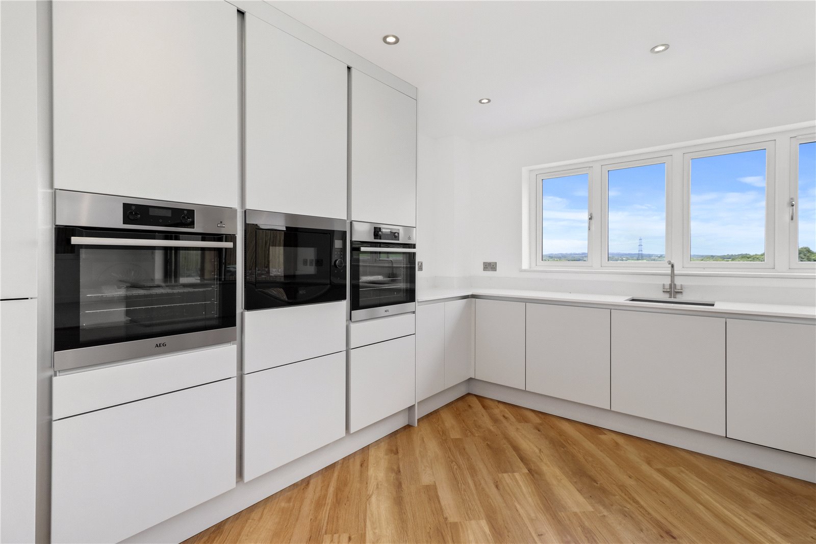 OPEN PLAN LUXURIOUS KITCHEN / BREAKFAST ROOM: 14 Feet x 12 Feet 2 Inches To be fitted with an extensive range of high-quality modern style influenced cupboard and base units with numerous high specification worktops and breakfast bar, continuation of the Amtico influenced light oak coloured wood effect parquet flooring, integrated appliances and cookers (awaiting final specifications). Double glazed powder coated windows with amazing views and aspect over the rear 108 Foot rear garden.