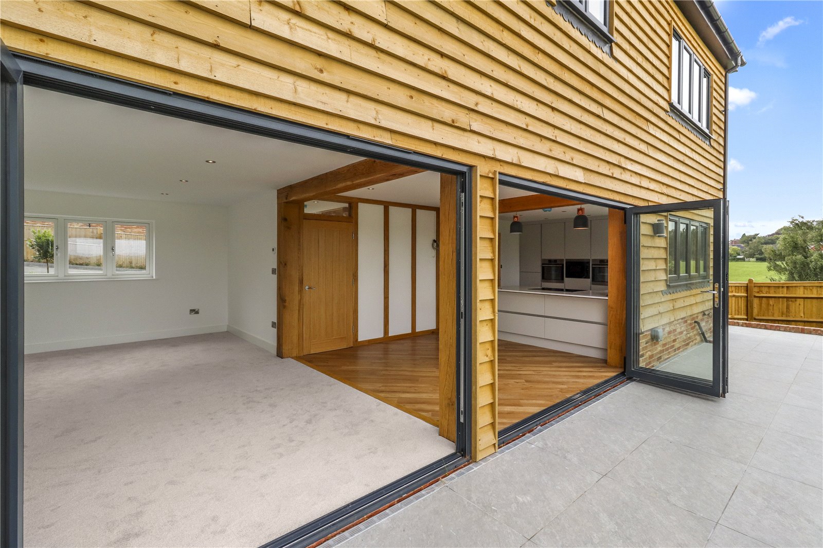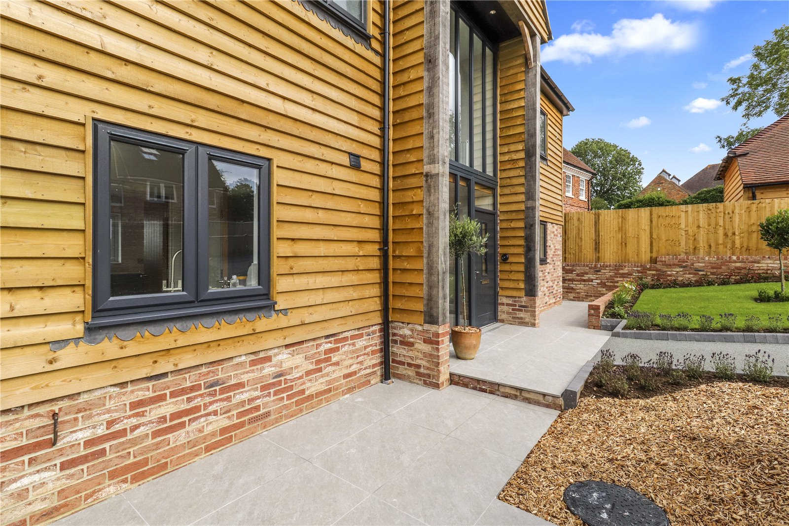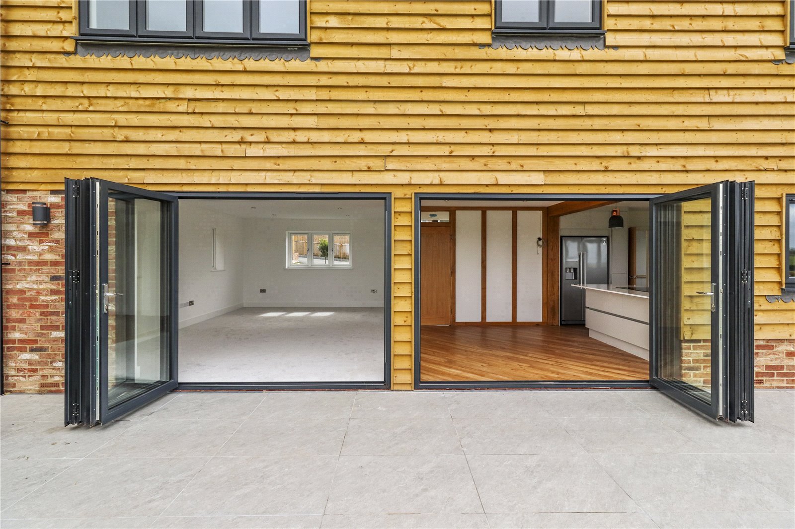 Built to a high standard and specification throughout, this very desirable classic, as well as contemporary designed detached five double bedroomed family village residence which is arranged over three storeys, cleverly combines todays modern open plan living styles with an elegant Sussex Country Barn influenced exterior, encompassing many of the beautiful features that some of the old country barns historically benefit from. These include a wonderful imposing vaulted central front entrance, natural lapped wooden exteriors and even some wonderful exposed interior feature wood beams.