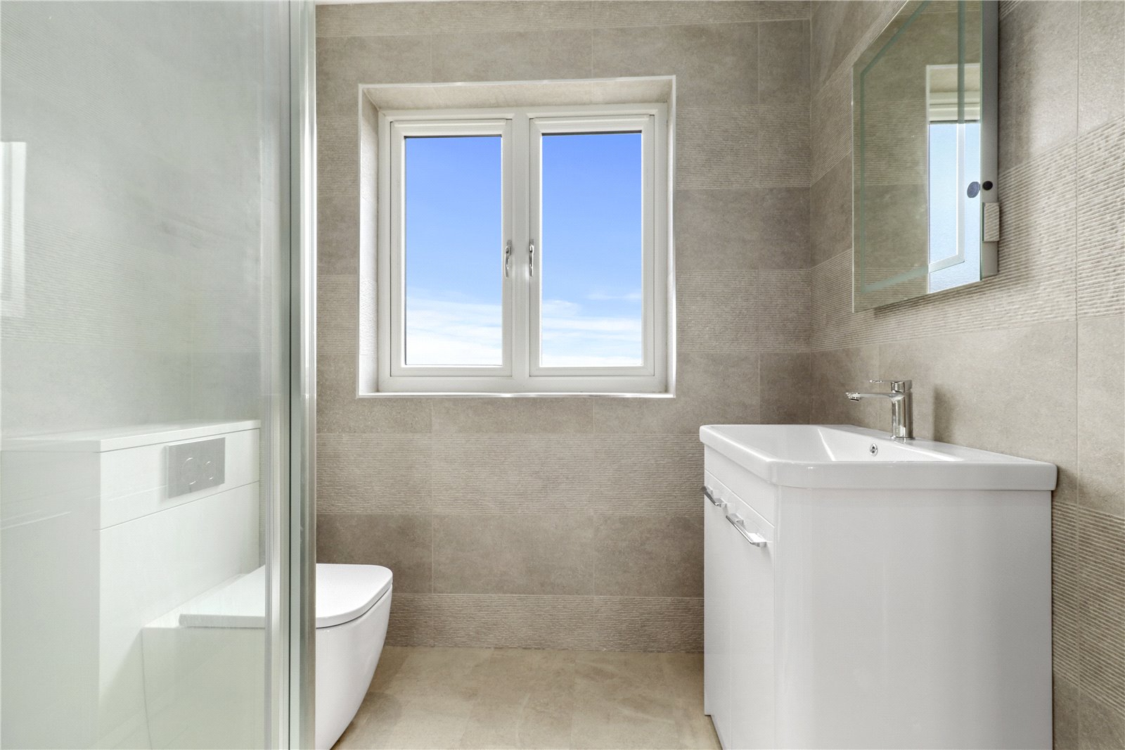 ENSUITE LUXURY SHOWER ROOM FOR BEDROOM ONE: Comprising of a heavy glazed fronted double sized shower with tiled walls and chrome shower control system, W.C., quality ceramic washbasin with chrome taps, chrome wall mounted towel rail, double glazed powder coated window with front aspect.