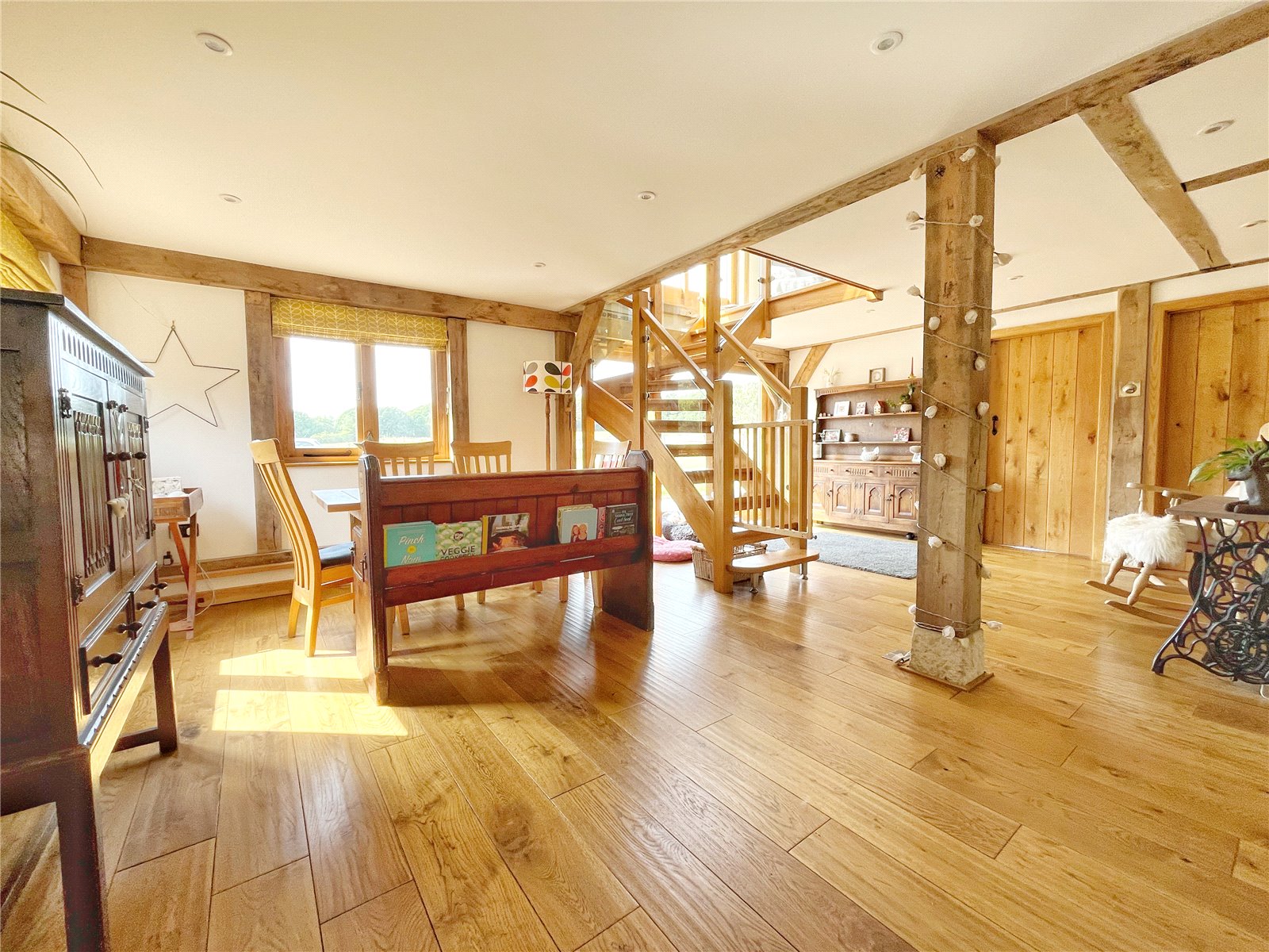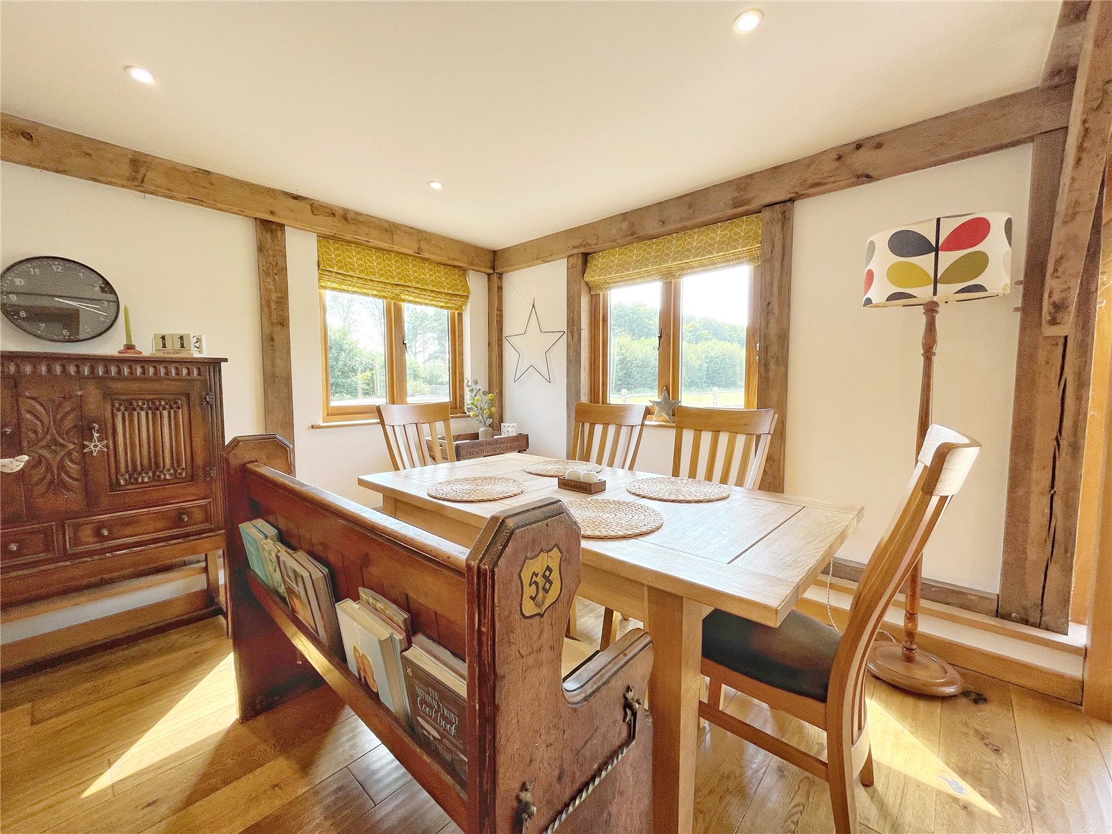 OPEN PLAN DINING ROOM: Comprising of a continuation of the attractive oak floors, further exposed feature oak beams to both walls and ceilings, double aspect room with oak framed double glazed windows with aspect to the front gardens and views beyond of the circa 5.2 acres.
