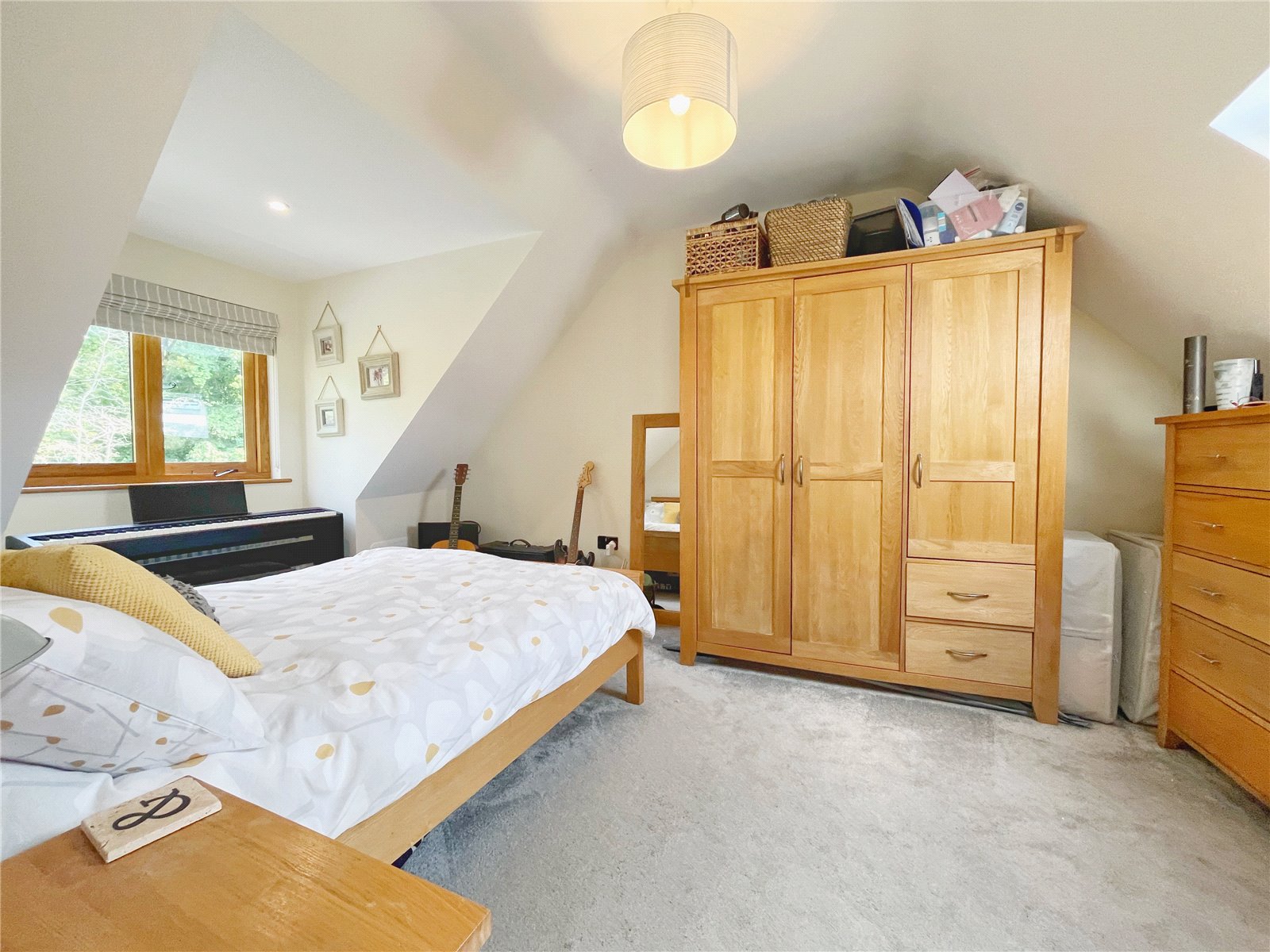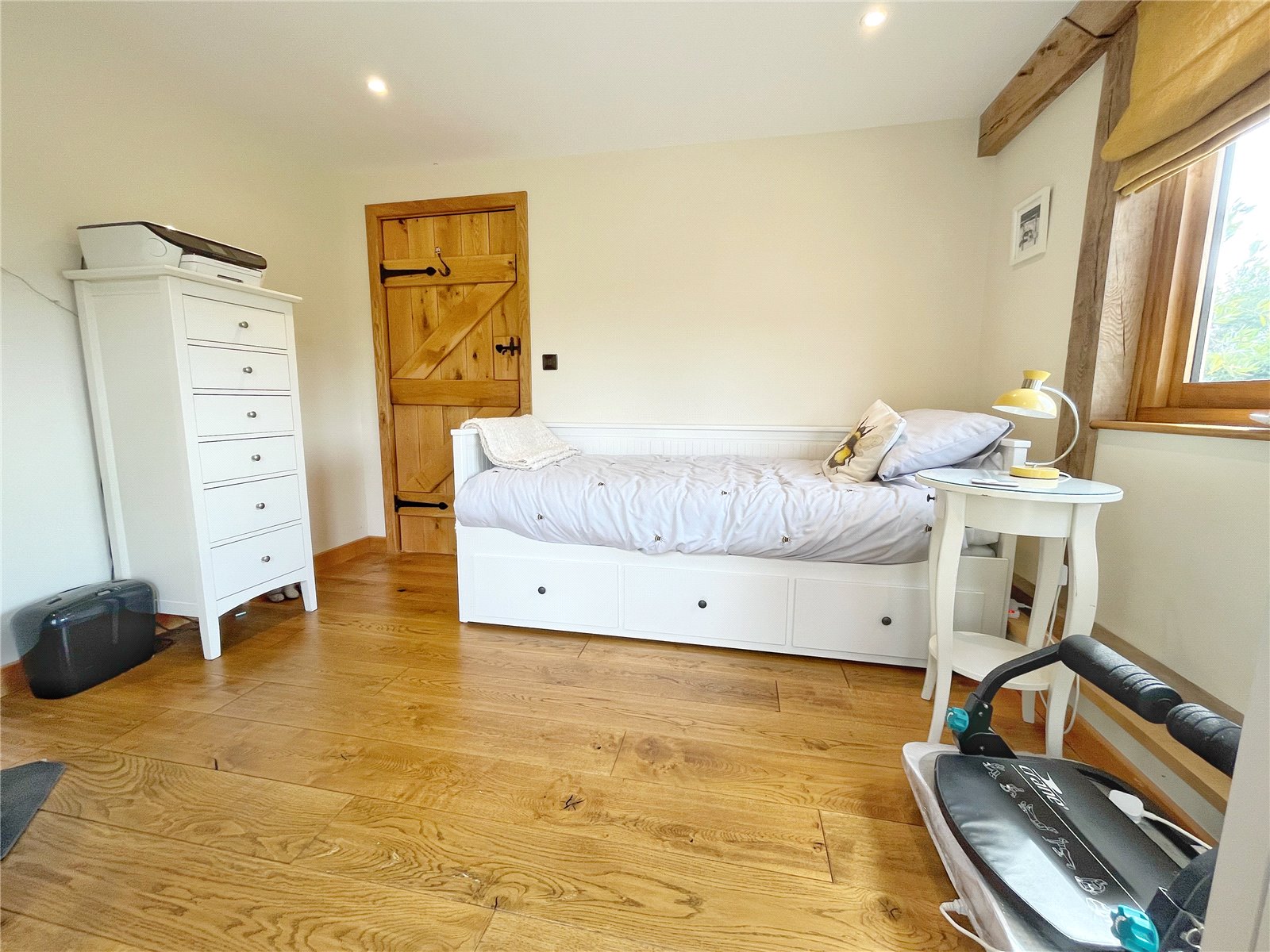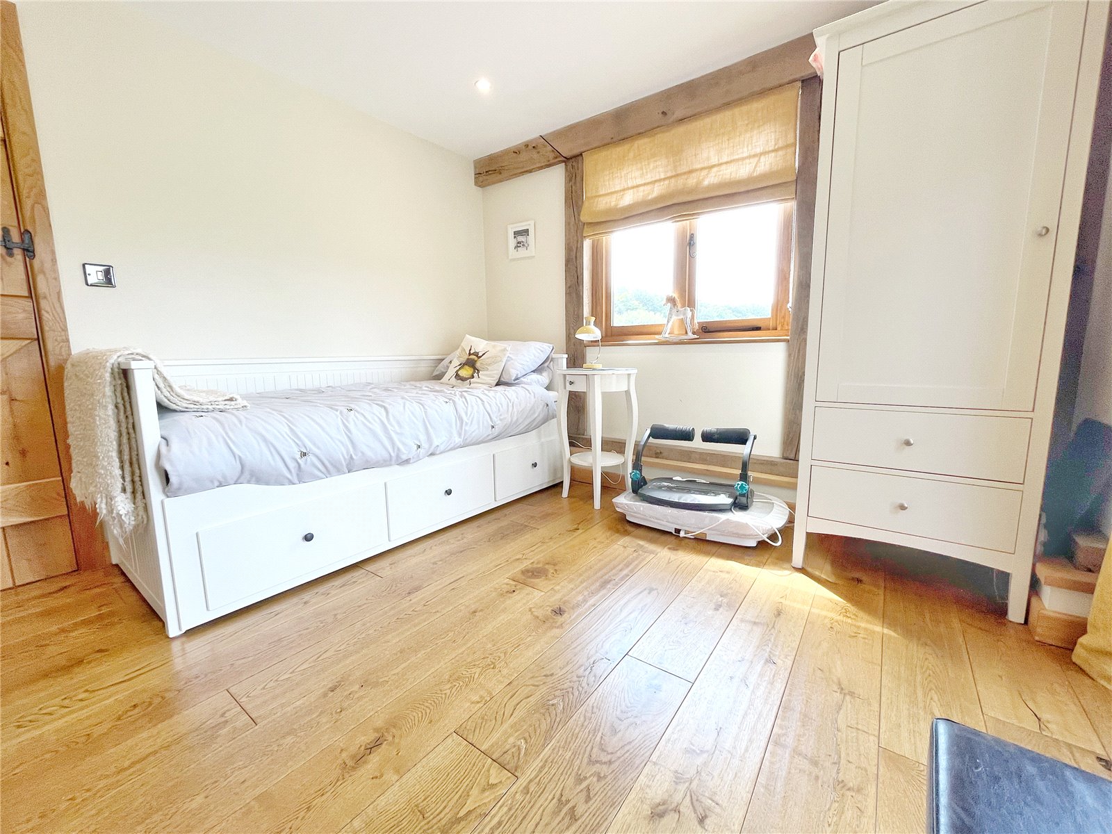 DOWNSTAIRS BEDROOM THREE: A double sized and double aspect room, oak floors. Downlights, exposed beams to walls and floors, double glazed oak framed windows and doors with aspect to and opening out to the gardens and enjoying wonderful far-reaching views.
