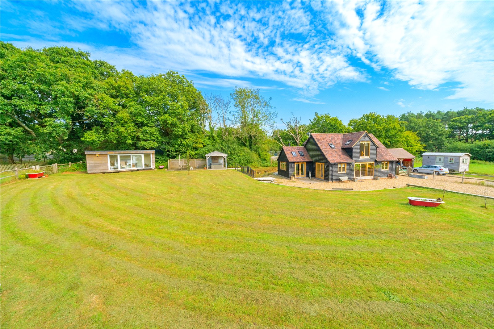 Outside, in addition to the generous parking and garaging, there is a detached stable complex, a static office and a large feature pond that could possibly be enlarged into a lake subject to planning.