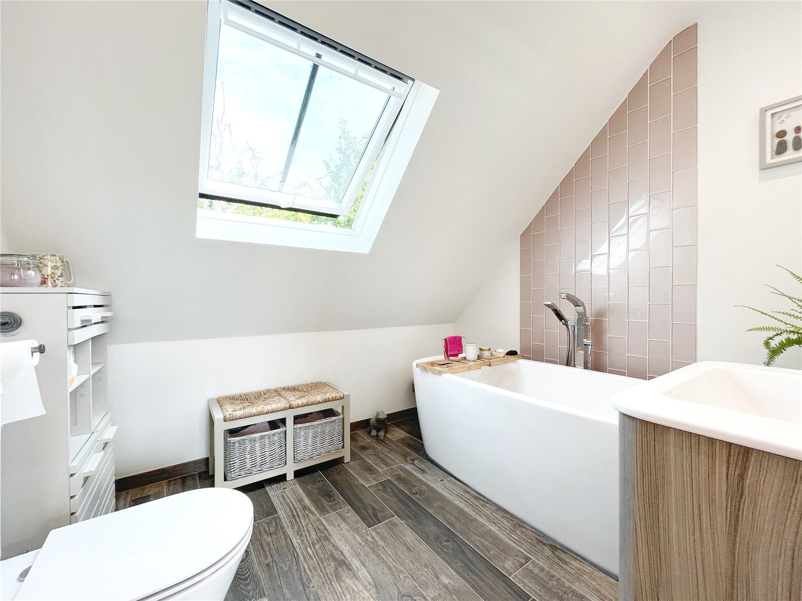 LUXURY FAMILY BATHROOM: Comprising of feature bath with mixer taps and shower attachment, part tiled walls, feature wash basin chrome mixer tap and vanity drawers under, tiled splashback and chrome mixer, W.C., feature tiled floor with oak styling. Double glazed window with view.