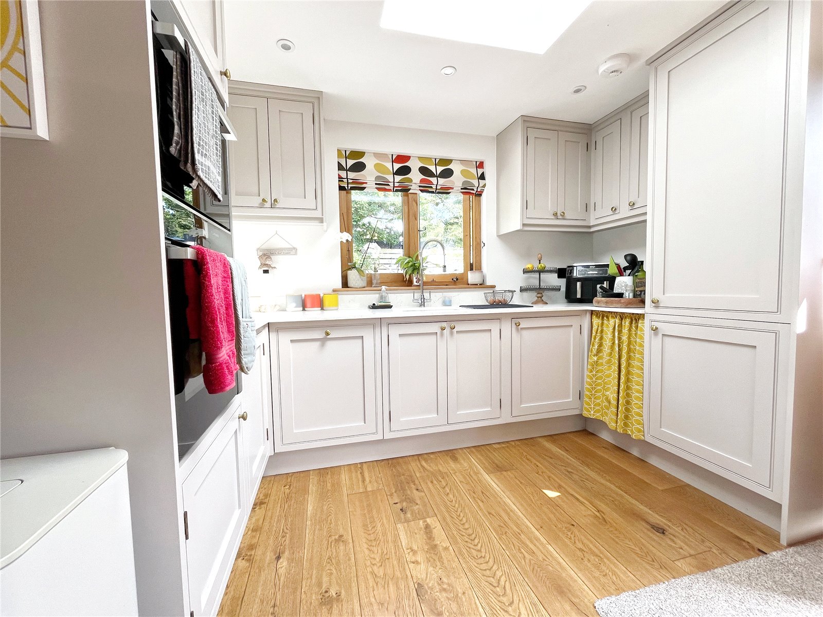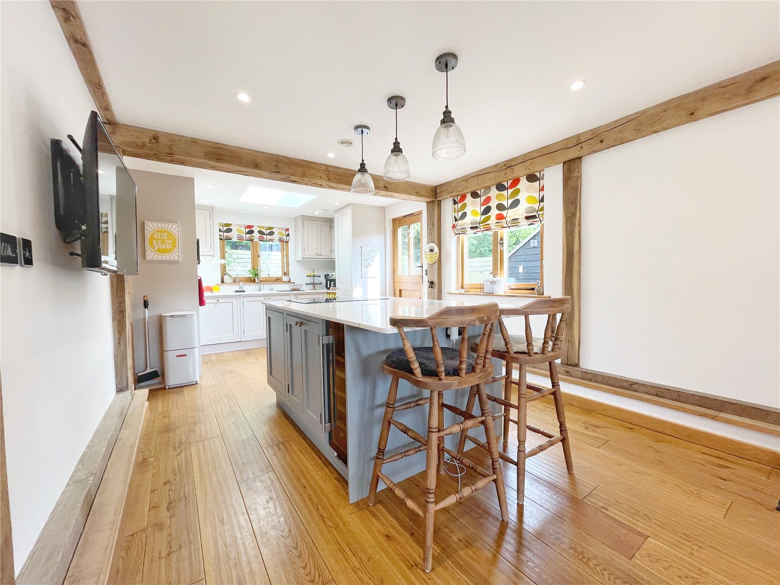 OPEN PLAN KITCHEN / BREAKFAST ROOM: Comprising of a bespoke range of modern Shaker style cupboard and base units with quartz worksurfaces over, inset sink unit with mixer tap, Neff built-in eye level oven and microwave, tall integrated fridge freezer, integrated dishwasher, further feature large central island with quartz top and integrated under counter wine fridge, fitted ceramic hob, feature lights above, fitted cupboards and drawers under, wall with tv point, oak framed windows with aspect to outside grounds, polished oak floor, door to side access, door to adjoining utility room.