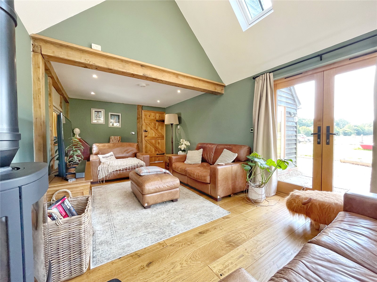 SITTING ROOM: A lovely triple aspect room with vaulted part ceiling, oak floors, fitted wood burner, exposed beams to walls and ceilings, double glazed windows and double doors opening out to the gardens and with beautiful far-reaching views beyond.
