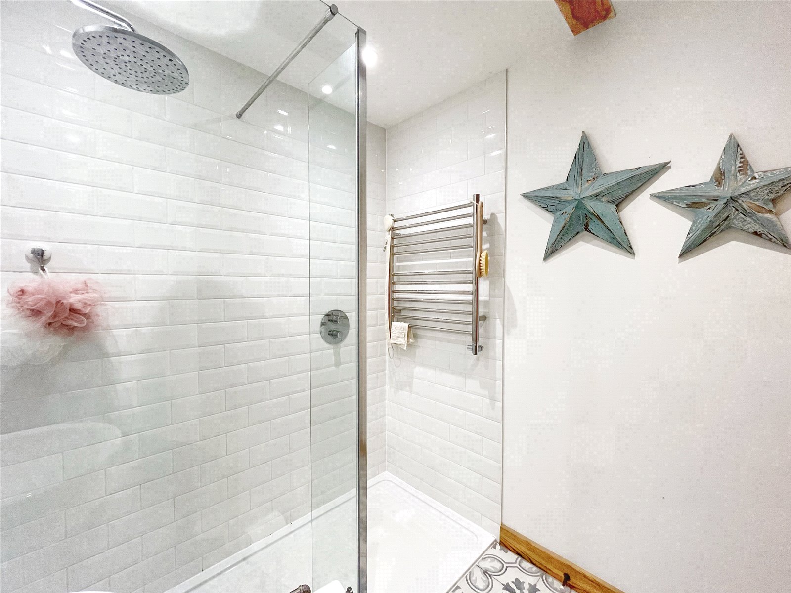 DOWNSTAIRS CLOAKROOM / SHOWER ROOM: With attractive oak door leading off from the main reception hall, with beautiful tiled floors, further tiled walls, W.C., wash basin with chrome mixer tap, exposed beams to ceiling, large double sized shower with heavy glazed sides, tiled walls, chrome radiator / towel rail, down lights.