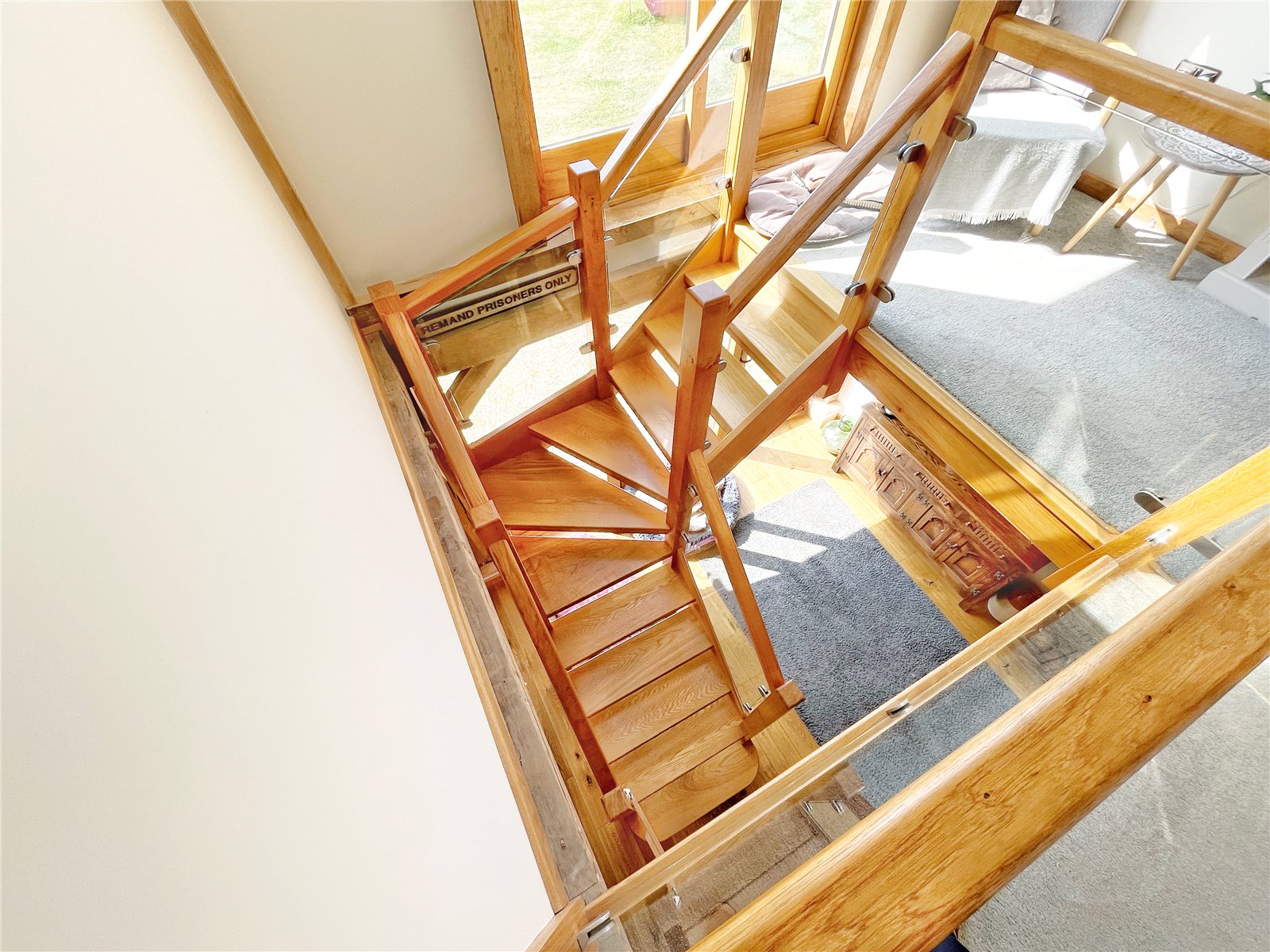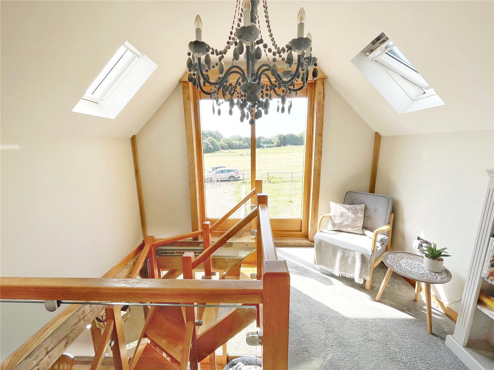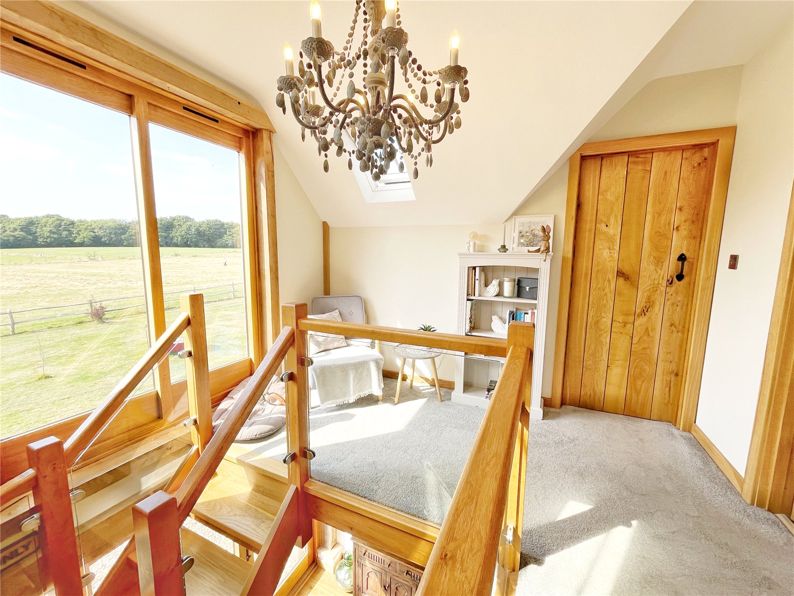 FEATURE GALLERIED FIRST FLOOR LANDING: Comprising of oak and glazed sides, vaulted ceiling, feature light, fabulous large double glazed and oak full height window with amazing views over the 5.2 acres and beyond, doors leading off to bedrooms one and two, as well the main family bathroom.